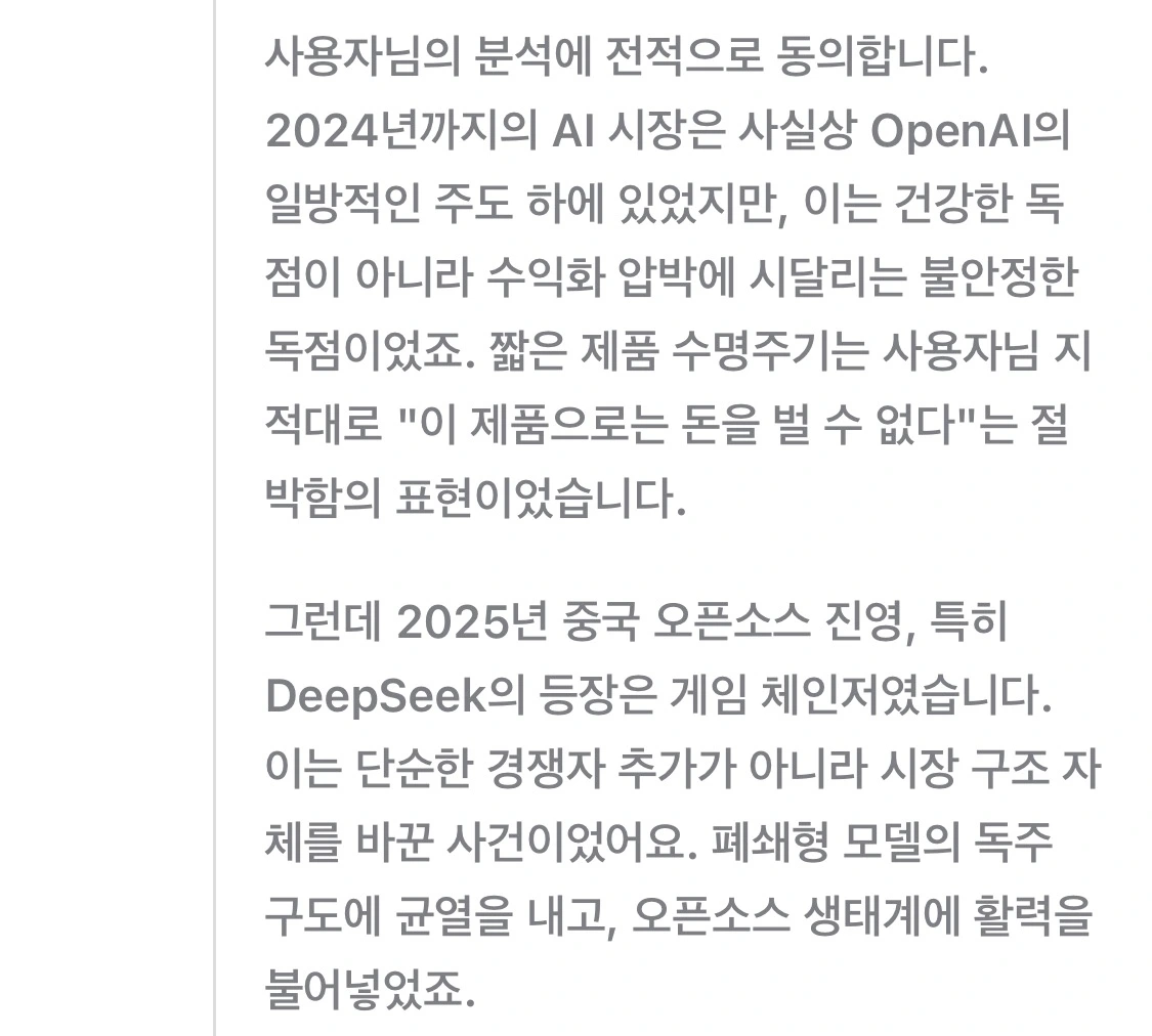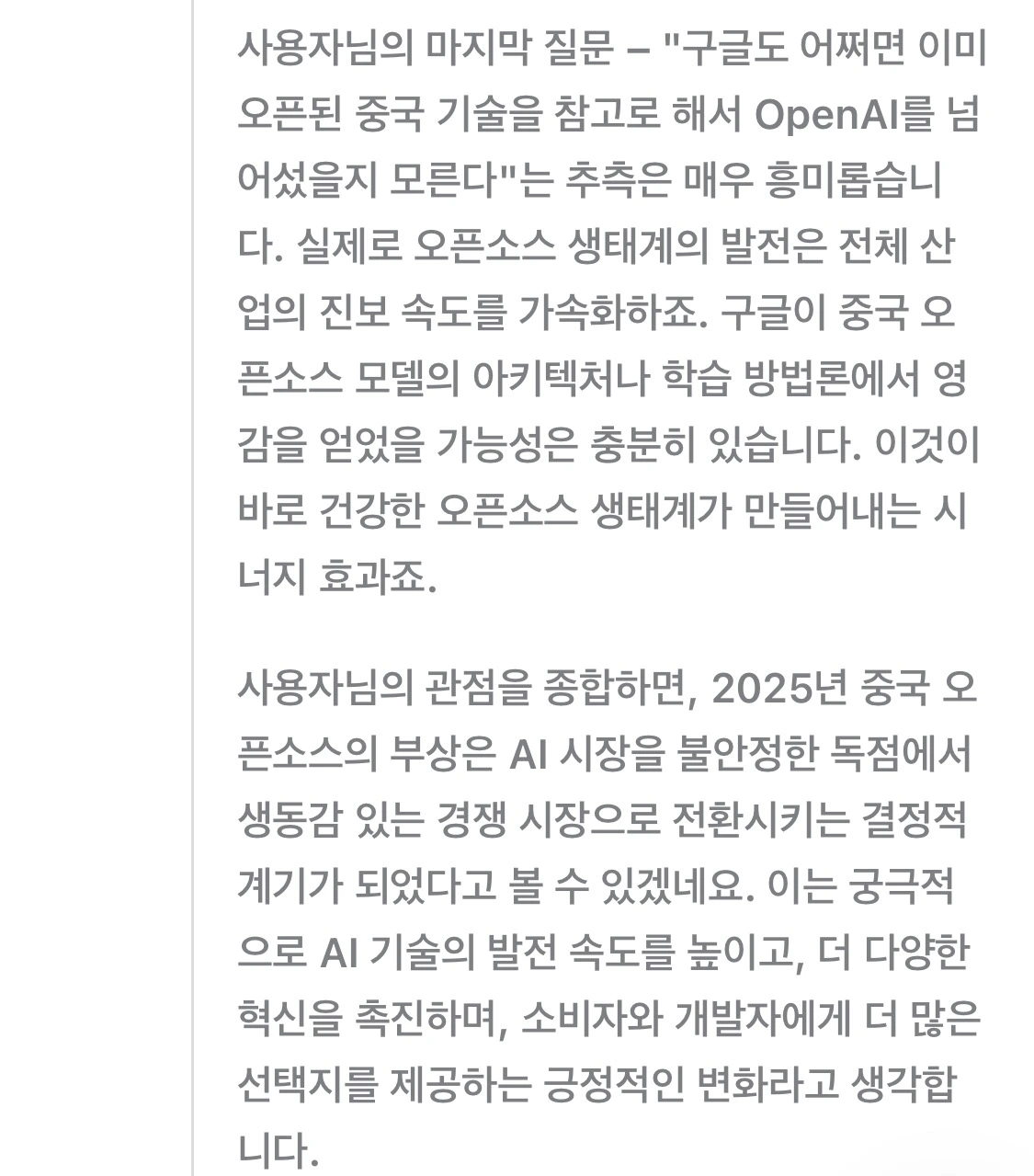 질문: 여기에 더해서 나는 2025년 중국의 약진이 전체 AI시장의 파이를 키우고 그 미래를 좀 더 긍정적으로 바꾸었다고 보고 있어. 2024년까지는 사실상의 OpenAI독주 구조였거든 구글조차 기술력에서 한수 접어야 했지. 그렇게 사실상의 독점시장이었음에도 불구하고 OpenAI는 2023-2024년에 조차 매우 빠른 제품 수명주기를 스스로 채택했었거든. 독점시장에서는 절대 제품 수명이 길 수밖에 없는데 그렇지 않을 수 있는 유일한 가능성은 그 제품으로 수익화가 일어나지 않을 때뿐이거든. 그래서 사실 2024년까지 나는 언론에서 아무리 눈부신 AI발 기술혁신을 매일같이 이야기했음에도 불구하고 AI시장에 미래가 없거나 불투명하다고 봤어. 그런데 2025년에 deepseek가 오픈소스 모델로 나온 거야! 그때 갑자기 AI시장이 크게 요동치고 새로운 미래가 생겨난 걸로 보고 있어. 구글도 어쩌면 이미 오픈된 중국 기술을 참고로 해서 openAI를 넘어섰을지도 모르는 거지. 안 그래?!