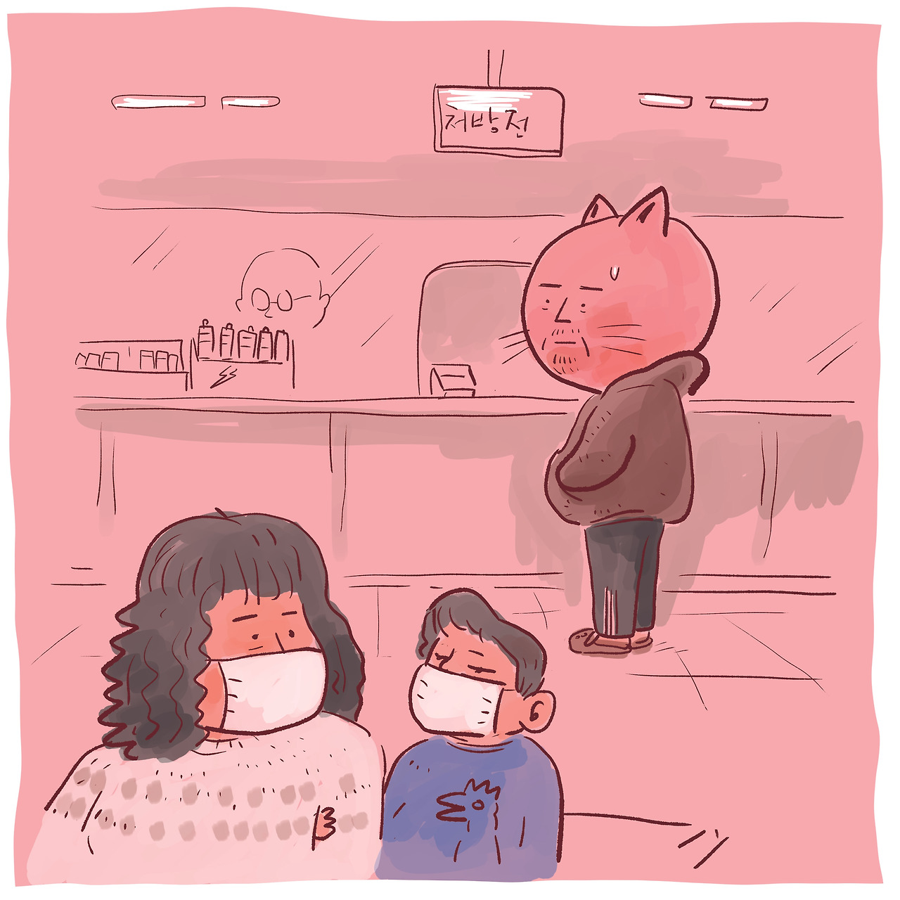 먼저 와서 약을 기다리는 엄마와 아들이 보였다