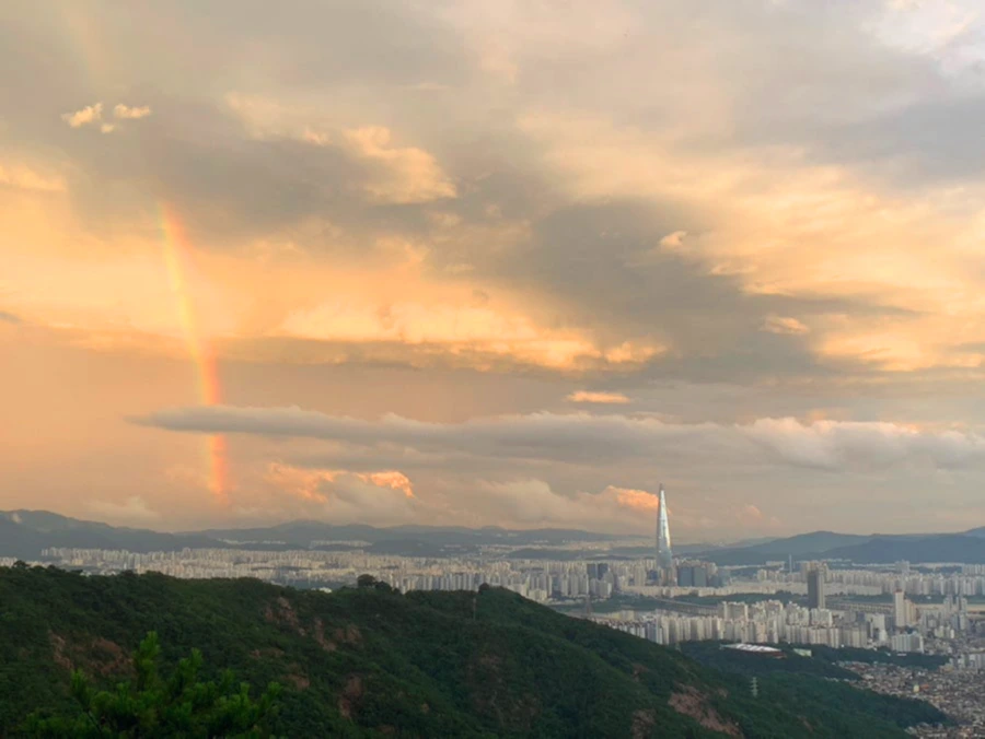 해가 저물어가며 해가 쨍하게 뜨길래 왠지 무지개가 보일 거 같았다.
