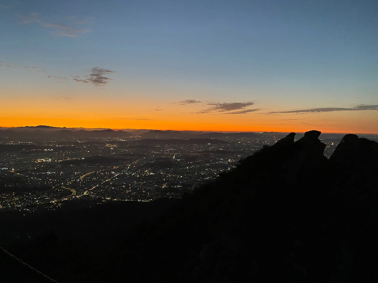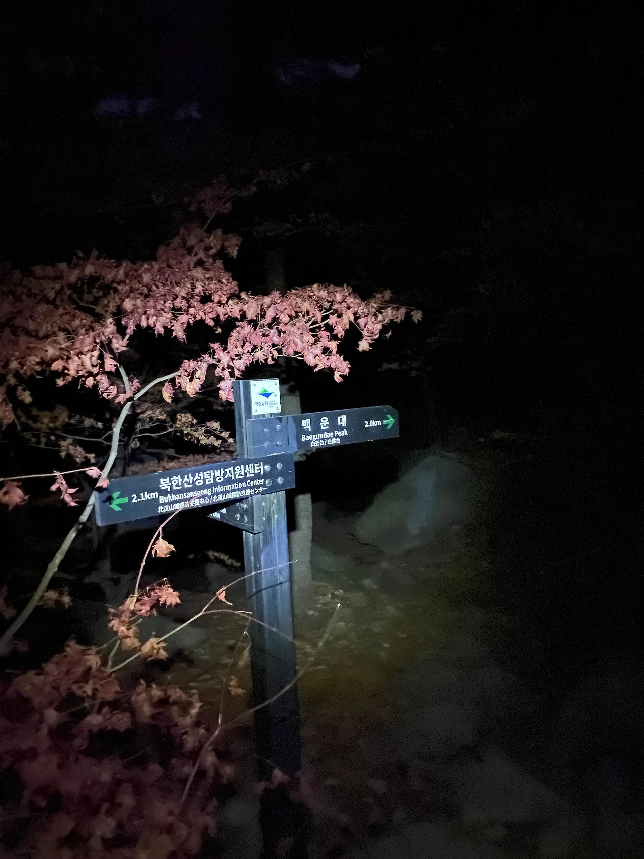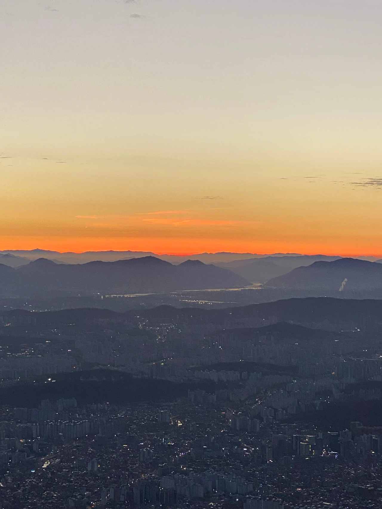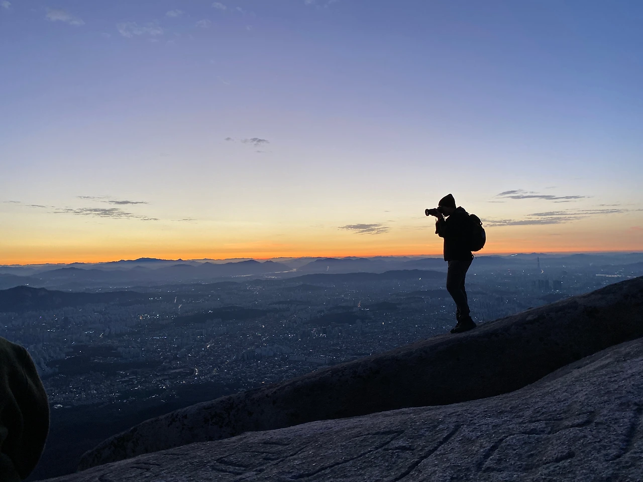 공기는 차가웠다. 하지만 허겁지겁 올라온 탓에 땀이 흥건해졌고 여려 겹으로 입었던 옷을 벗어 배낭에 넣었다. 그렇게 한 시간가량을 올라와 고개를 돌려 뒤를 보았다. 산 아래 펼쳐진 야경의 불빛이 공포와 함께 내디딘 발걸음이 꽤 높은 곳을 향했었구나 하고 깨달았다. 내가 올라온 북한산 탐방지원 센터 경로 반대쪽 우이동 방면에서 올라오는 길에서는 많은 젊은이들이 올라오고 있었다. 사람들이 많이 보이기 시작하면서 내 공포는 사라졌다. 저 멀리 동쪽에 보이는 산의 등고선 위로 붉은색과 검푸른 색이 이루는 그러데이션이 너무 아름다웠다. 조용하고 생각에 잠기게 만드는 여명의 시간이 너무 포근했다.