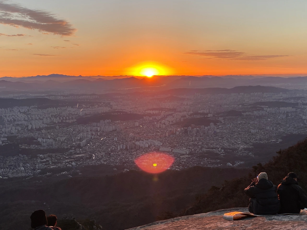 마당바위에 앉아 저 멀리 앞을 내다보았다. 서울의 동쪽 그리고 한강 물줄기를 따라 저~멀리 팔당 너머까지 보였다. 지평선 부근에 자리한 산등성이를 따라 아름다운 풍광이 나를 압도했다. 말없이 조용히 앉아 가방에서 텀블러와 스테인리스 컵을 꺼내어 커피를 따라 마셨다. 이어폰으로 자우림의 스믈 다섯 스물하나를 들었다. 칼바람에 벗어두었던 경량 패딩과 바람막이를 여미어 입었지만 등에서 머리까지 척추를 따라 흐르는 전율이 짜릿함과 몽환적인 기분을 느끼게 해주었다. 그렇게 일출까지 보며 마당바위에서 30여 분 가량 마음을 치유하고서 하산을 했다.