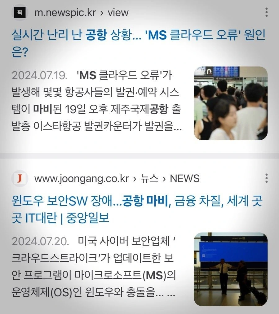 사절단을 기다린 건 Microsoft 보안 업데이트에따른 IT이슈 였고, 공항/운수관련된 시스템이 마비가 되었다.