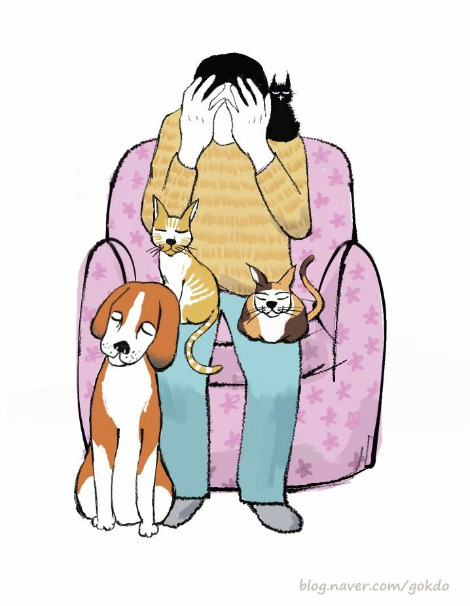 뚜기가 물었다. 그러나 애쿠는 대답하지 못했다. 애쿠도 그게 뭔지 알지 못했기 때문이다. 애쿠가 막 대답을 얼버무리려던 그때 문이 세차게 열리더니 작가의 엄마가 씩씩거리며 거실로 뛰어나왔다. 그리고 개와 고양이들을 차갑게 째려보면서 무언가 욕지거리를 중얼거리고는 그대로 집을 나가버렸다. 뒤 따라 나온 작가는 현관문이 요란하게 닫히는 소리를 들으며 소파에 털썩 주저앉아 울분을 토했다.