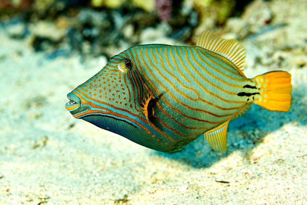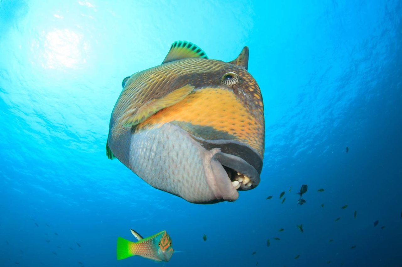 색이 알록달록하고, 주둥이 위에 있는 검은 줄이 콧수염처럼 생긴 타이탄트리거 피시(멋진 콧수염 때문에 머스타치 트리거 피시라고도 부른다)는 산란기(4~6월)에 유독 공격적이다. 알을 낳은 자신의 모래 둥지 근처에 사람이 오면, 다른 종류의 물고기가 오면 전부 다 물어뜯기 때문이다.