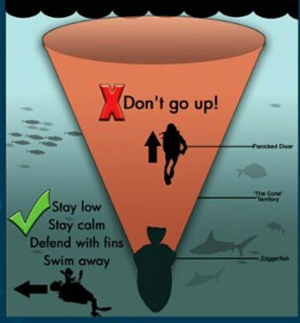 1) 일단 급상승은 위험하다. 절대 패닉이 와선 안 된다.(말이야 쉽다) 그러다 감압병 걸릴라. 10미터 정도면 그래도 치명적이진 않을 텐데 20미터권에서 타이탄 트리거피시를 봤다고 로켓처럼 솟아오르면 물린 것보다 더 위험한 결과를 초래한다. 그리고 올.라.가.면. 올.라.갈.수.록. 쫒아오기 쉽다. 거기가 행동반경이기 때문이다. 타이탄 트리거피시로부터 원추형으로는 다 자기 영역이다.