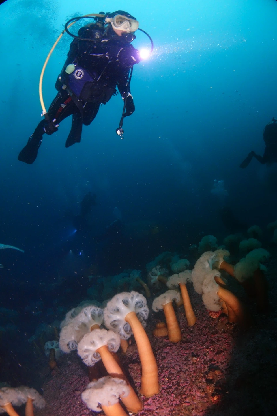 ’섬유세닐말미잘‘이 잔뜩 핀 말미잘동산을 만난 것이다. 깊고 어두운 바다에 하얀 꽃밭이 갑자기 나타난 것 같았다. 기둥 위에 하얗게 보이는 촉수가 마치 솜사탕 같기도 하고 대형 콜리플라워 같이 보이기도 했다.