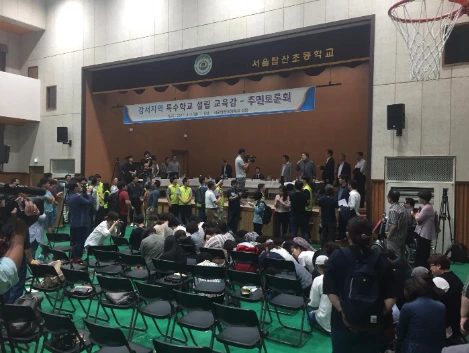 이 발언에 학부모들은 우르르 일어나 아파트 주민들을 향해 무릎 꿇었다. 기자들은 그들을 향해 연신 셔터를 눌러댔고, 아파트 주민 대표는 "저건 다 계획된 쇼"라며 모두 퇴장하자고, 얘기 다 끝났다고 소리치며 사람들을 몰고 나가버렸다.(관련 기사)