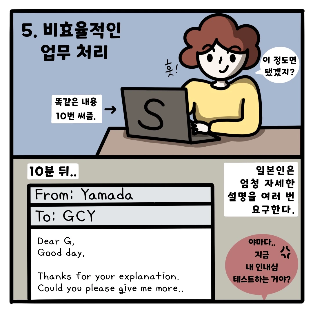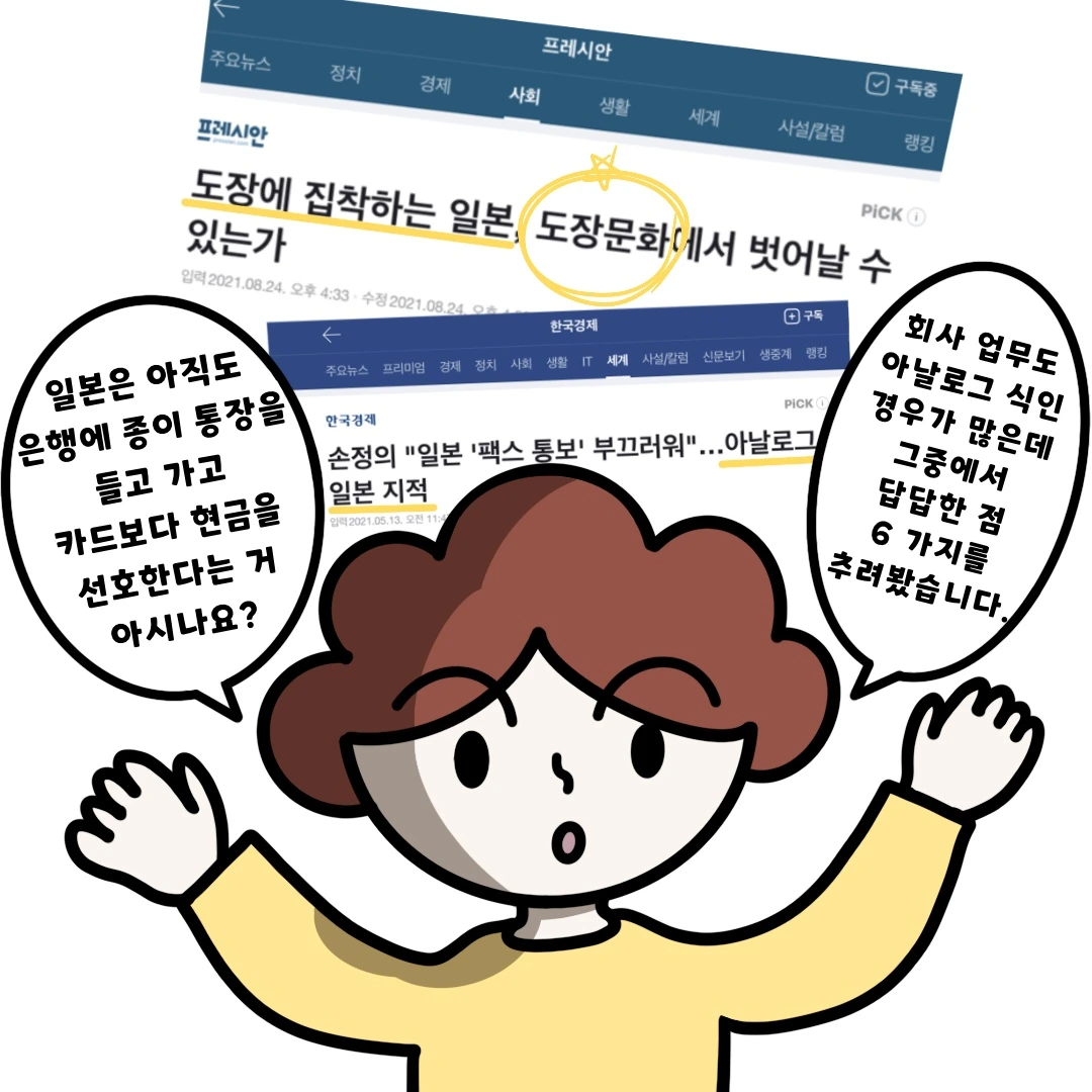 제가 4년간 일본계 회사에 다니면서 느꼈던 답답한 점 6가지를 뽑아봤습니다. 전해 들으니 소*트뱅*같은 일본 대기업도 수기 장부를 쓴다고 하더라고요. 엄청난 아날로그 문화죠? 선진국 대부분이 디지털 전산화, 핀테크 활용 등 디지털 추세를 적극 따르고 있는 반면, 일본은 그렇지 않아 상대적으로 그 보수성과 폐쇄성이 더 강조되는 듯 보입니다. 이런 일본 문화는 '갈라파고스 문화'라고도 불리는데요, 앞으로 10년 후, 20년 후에도 이런 문화를 고수할 수 있을까요? 그렇다면 제 일자리도 계속 존재할는지... 의문입니다.