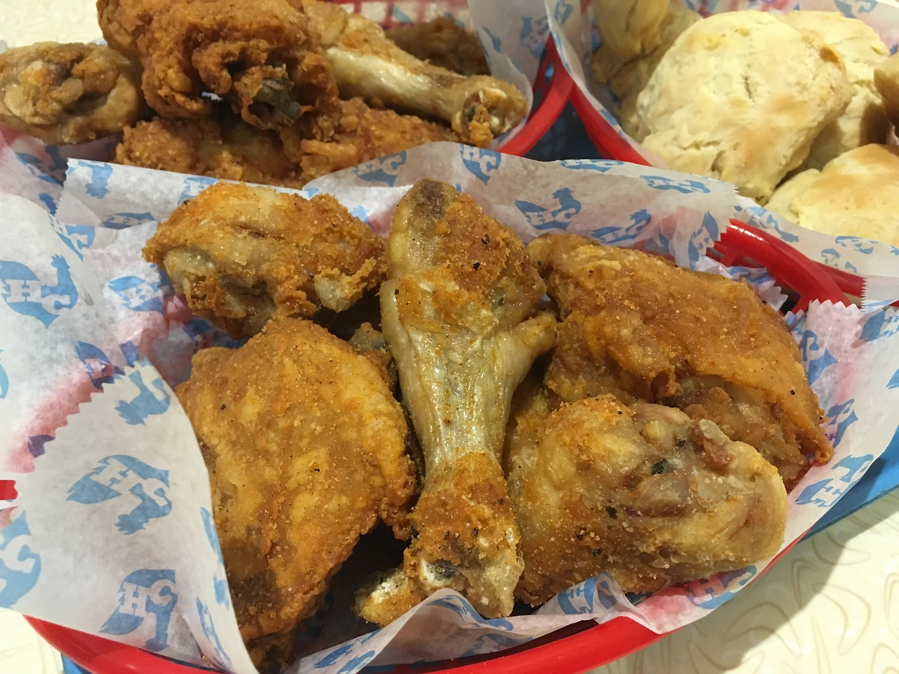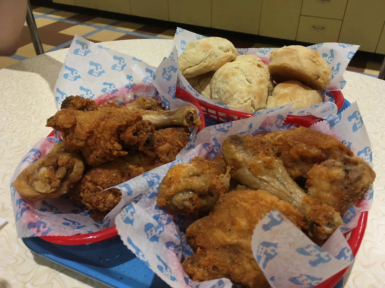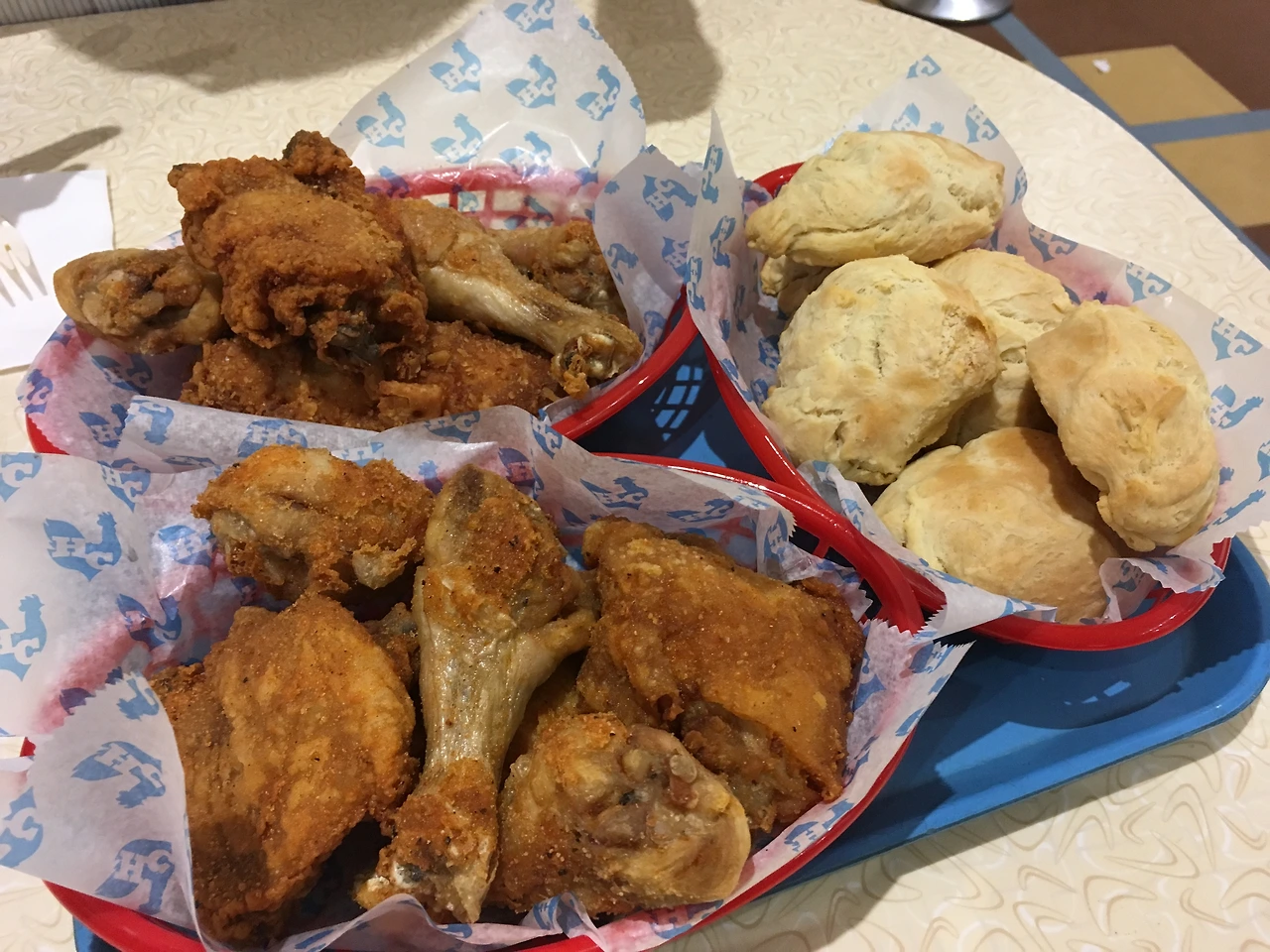약간 당황스러운 맛집 분위기이긴 했으나 치킨만 맛있으면 되지. 치킨 한 마리 (한 버킷이라고 하더라)와 비스켓 6개 세트가 32달러 정도다. 치킨 한마리에 3만 5천원이라니. 미국이 물가가 비싸도 닭다리나 닭가슴살은 정말 저렴한데, 맛집이라 그런지 정말 비쌌다. '마...맛있겠지...'