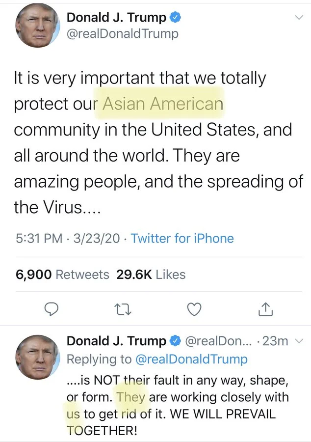 트럼프가 웬일로 "아시안-아메리칸을 보호해야 한다"고 트윗을 날렸지만 교묘하게 'Asians are the spreading of the Virus...' 에서 글자수를 빌미로 끊어버렸다. 한 나라의 대통령이 할만한 장난인가 이게? 인플루언서도 조심해서 말하는 판국에 정말 불안만 가중시킬 뿐이다.