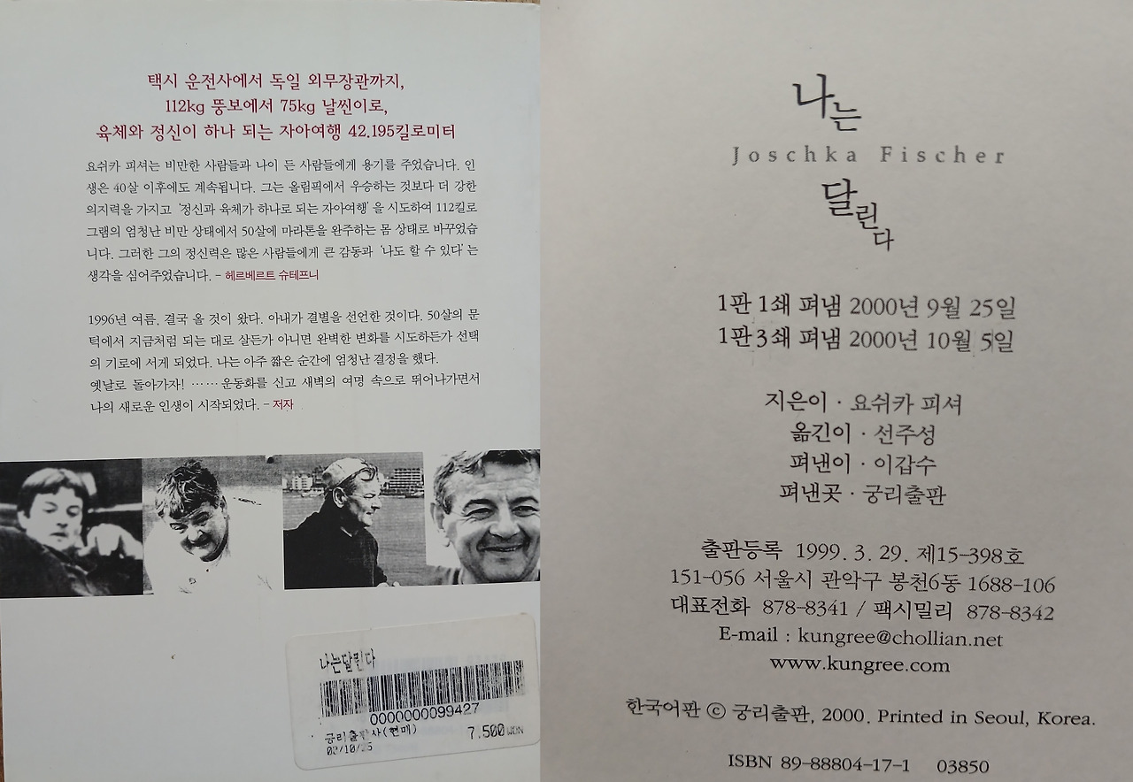 최초로 달리기에 관심을 갖게 된 건 돌이켜보니 어느새 25년 전이다. 독일의 외무부 장관 요쉬카 피셔의 에세이 『나는 달린다』 를 사서 읽은 게 2000년이다. 50대를 눈앞에 두고 1년 만에 112kg 뚱보에서 75kg 몸짱으로 거듭난 중년 남자의 자기 개조 경험담은 독일을 넘어 우리나라에서도 엄청난 반향을 이끌어내며 달리기에 대한 관심과 열풍이 시작된 계기가 되었다.