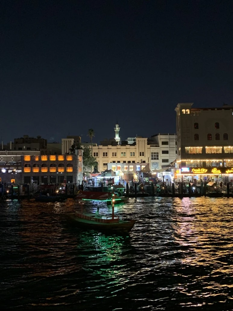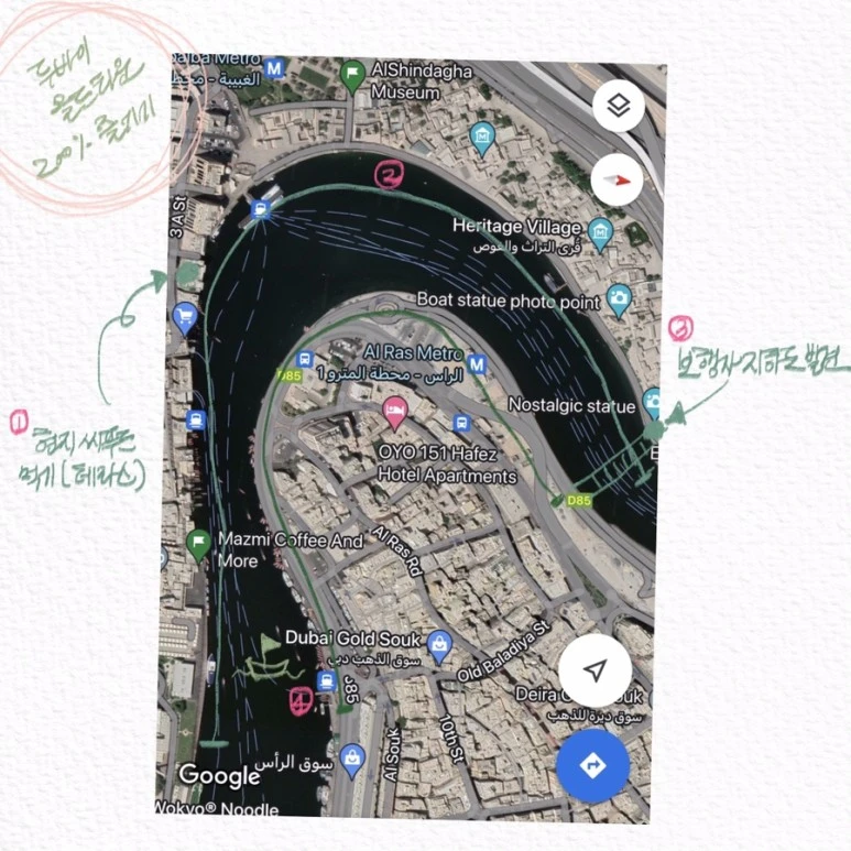 Friday 8pm, 고대해온 밤의 헤리티지 빌리지 산책. 알시프(Al Sheef) 지역엔 머리와 꼬리, 두 군데 주차장이 있다. 만보 수준의 걷기를 원할 때는 머리에, 그 이상을 원할 땐 꼬리에 주차를 하고서 걷는다. 이날은 두바이 커피 박물관이 있는 머리 쪽에 주차를 하고는 워쿄(Wokyo) 누들 숍에서 여행을 시작했다. 이는 부둣가를 따라 걷는 일정인데, 당신이 있는 계절이 두바이의 겨울(11월 - 3월)이라면 낮이고 밤이고 걷기에 행복만 할 것이고, 여름이라면 이 저녁 시간이 유일한 찬스다. 마즈미(Mazmi) 커피 집까지 부둣가를 따라 닿고 나면 자연스레 수크를 통과하게 되고, 여전히 부둣가를 따라가면 첫 번째 선착장이 나온다. 거기서 조금 더 걸으면 어서 와서 맛 보라는 호객 행위로 시끌시끌한 음식점가가 펼쳐지는데, 난 하필 여기가 늘 궁금했다. 탁 트인 부둣가의 테라스 석 이라니 분명 보석 같은 자리. 헌데, 지나다니는 행인들을 잡으려는 식당 직원들이 만드는 시장 같은 분위기는 또 부담스러운 거다. 그렇게 아쉽지만 싫은 척하며 지나쳐 온 게 몇 번이 쌓였다. 여태 우아함은 혼자 지켜 내왔지만, 오늘은 진짜 도시를 봐야 했다. 오늘만큼은 꼭 그곳에 앉아 보리라 마음 먹는다. 그 산만한 분위기 속에는 말로 하기 어려운 무언가가 나를 당기고 있었다. 오늘은 용기를 내야 했다. ---