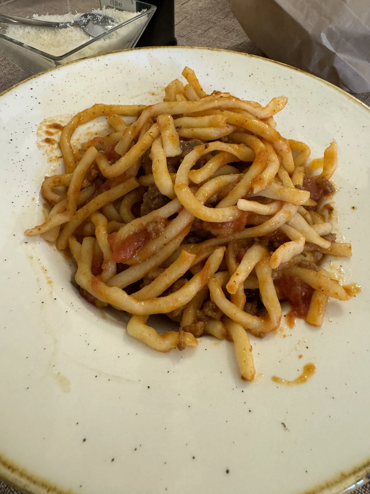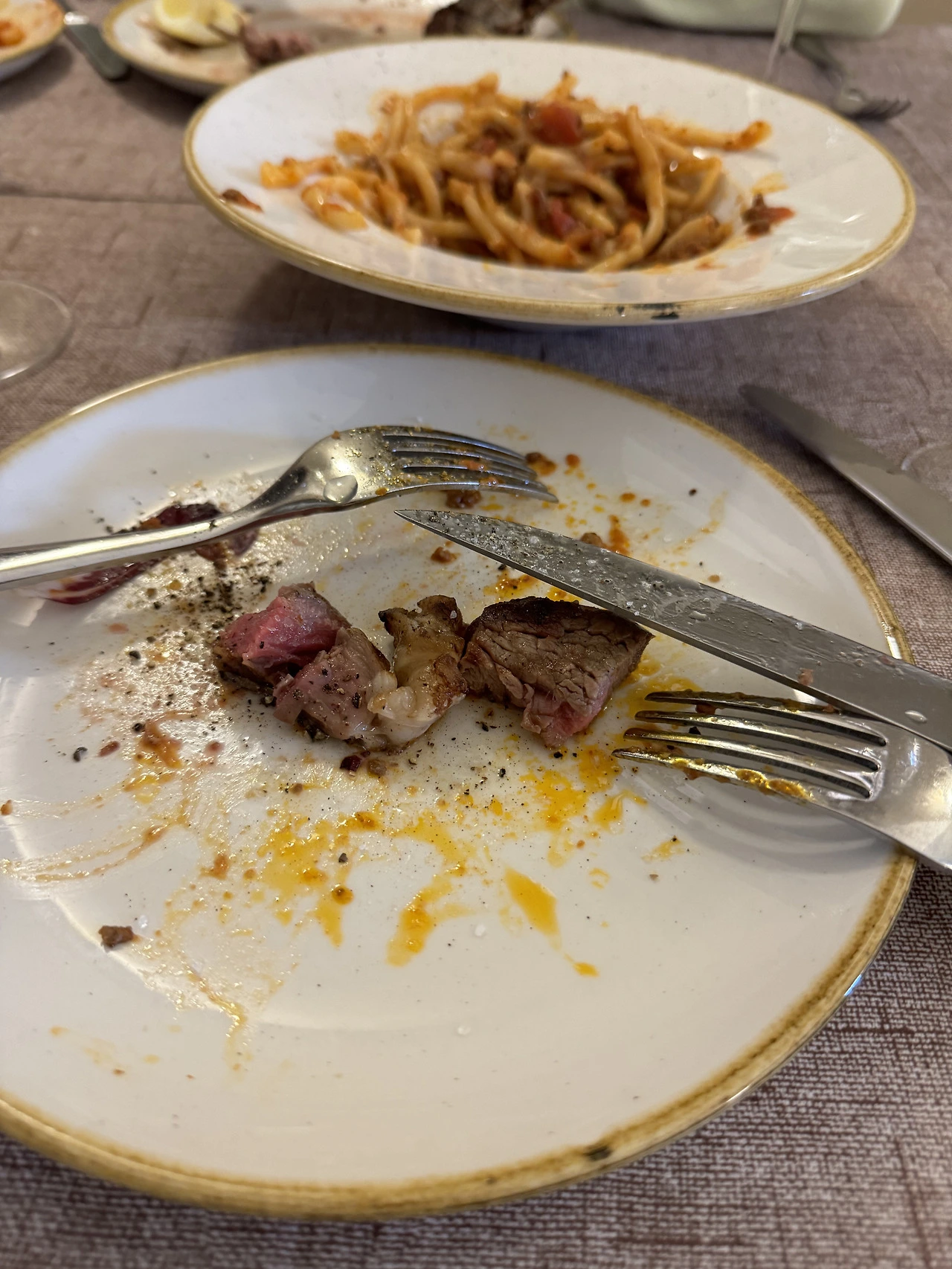파스타 면도 뭔가 토스카나 지방의 특색이 있는 그런 면이었던 걸로 기억난다. 독특한 면을 씹고 있자니 뉴욕의 마레아 Marea의 푸실리가 생각났다. 스테이크로 배를 채우느라 정작 파스타 맛은 평범했던 것으로 기억한다. 초면인 사람과 같이 음식을 먹는 일은 잘 없는 일인지라 나는 친절함을 보여야겠단 생각에 열심히 스테이크를 썰었다. 또 여기까지 왔으니 와인을 시키지 않을 수 없다 싶어 한 잔씩 시킬 때 합류했는데 글쎄... 내가 왜 그랬을까. 2024년 5월 3일에 벌게진 얼굴로 피엔차를 돌아다니는 한국 여자가 있다면 바로 나다. 와인 글라스의 1/3도 채워주지 않은 와인을 겨우 두세 모금 했을 뿐인데 누가 보면 소주 한 병쯤 끝낸 얼굴로 보였을 거다. 아무튼 가격적으로 굉장히 괜찮은 식당이었다.