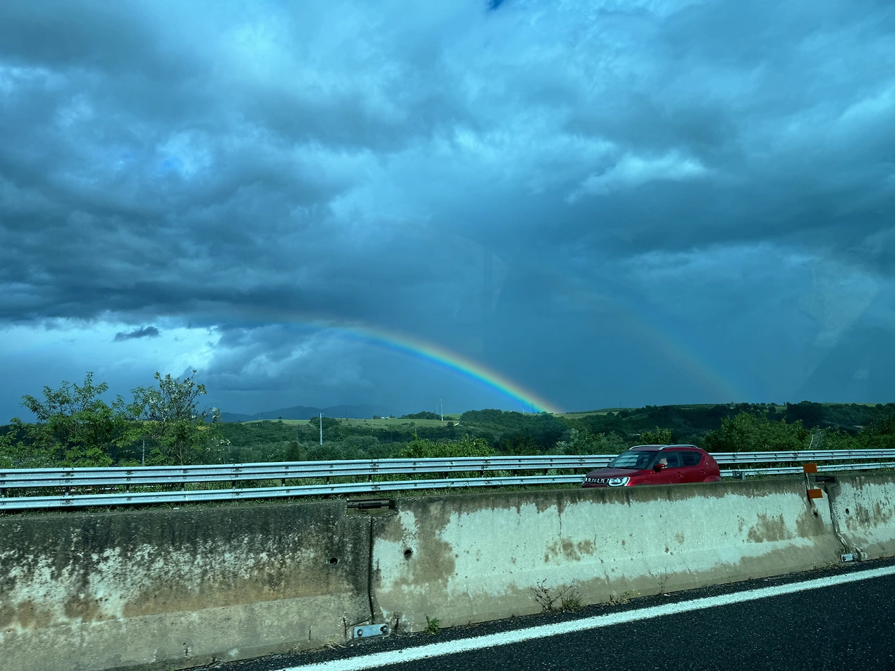 로마로 돌아오는 길, 다시 비가 내렸다가 구름이 꼈다가하며 변죽을 울린다. 무지개가 떴다는 A씨의 말에 사람들 다 창문을 바라본다. 무려 쌍무지개다. A씨가 앉아있는 쪽의 창문에서만 보였기에 사진 좀 찍어달라고 부탁했고 A씨는 흔쾌히 찍어주었다. 제주도에 살면서 많은 무지개를 보았는데 저렇게 완벽하게 반원을 그리는 무지개는 처음 봤다.