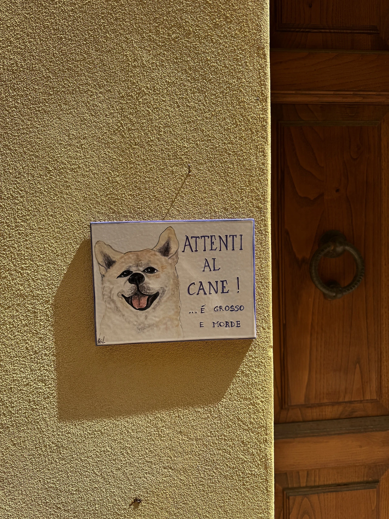 피엔차의 날씨는 끝내주게 좋았다. 지나가다가 본 개조심!이라고 쓴 팻말도 귀여웠다. 저 밑에 쓰인 E GROSSO와 E MORDE의 뜻이 big and bites라는 건 방금 알았지만 그래도 귀여움이 변색되는 건 아니다. 피엔차에서 단 하나 단점이 있었다면 몇몇 기념품샵 할머니들이 불친절하고 날 서있었다는 것 정도였다.
