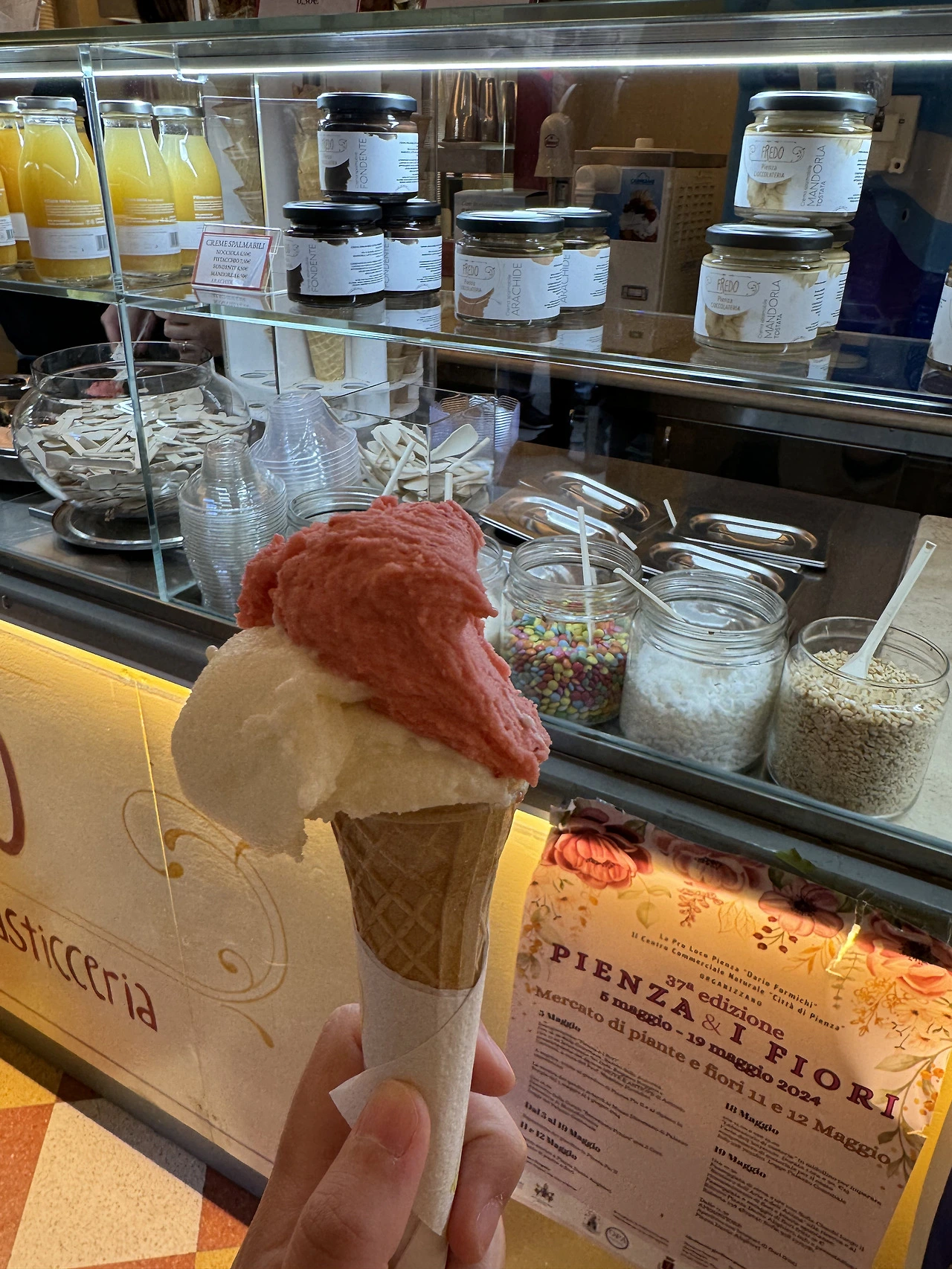 이탈리아 여행을 가기 전에 이탈리아인의 "제대로 된 젤라또 가게를 고르는 법"을 인스타에서 본 적이 있다. 젤라또를 산처럼 쌓아두고 그 위에 원재료를 놔둔 곳은 관광객들이나 가는 곳이니 절대 가지 말라는 경고를 했다. 괜찮은 가게들은 오히려 젤라또 표면이 플랫하거나 아예 뚜껑을 닫아둔 곳이라고. 아마 이 가게도 일단 멀리서 보고 젤라또 뚜껑이 전부 닫혀있는 데라 믿고 들어간 것 같다. 우리가 젤라또를 고르고 나오니 뒤에 줄이 길게 서 있었다.
