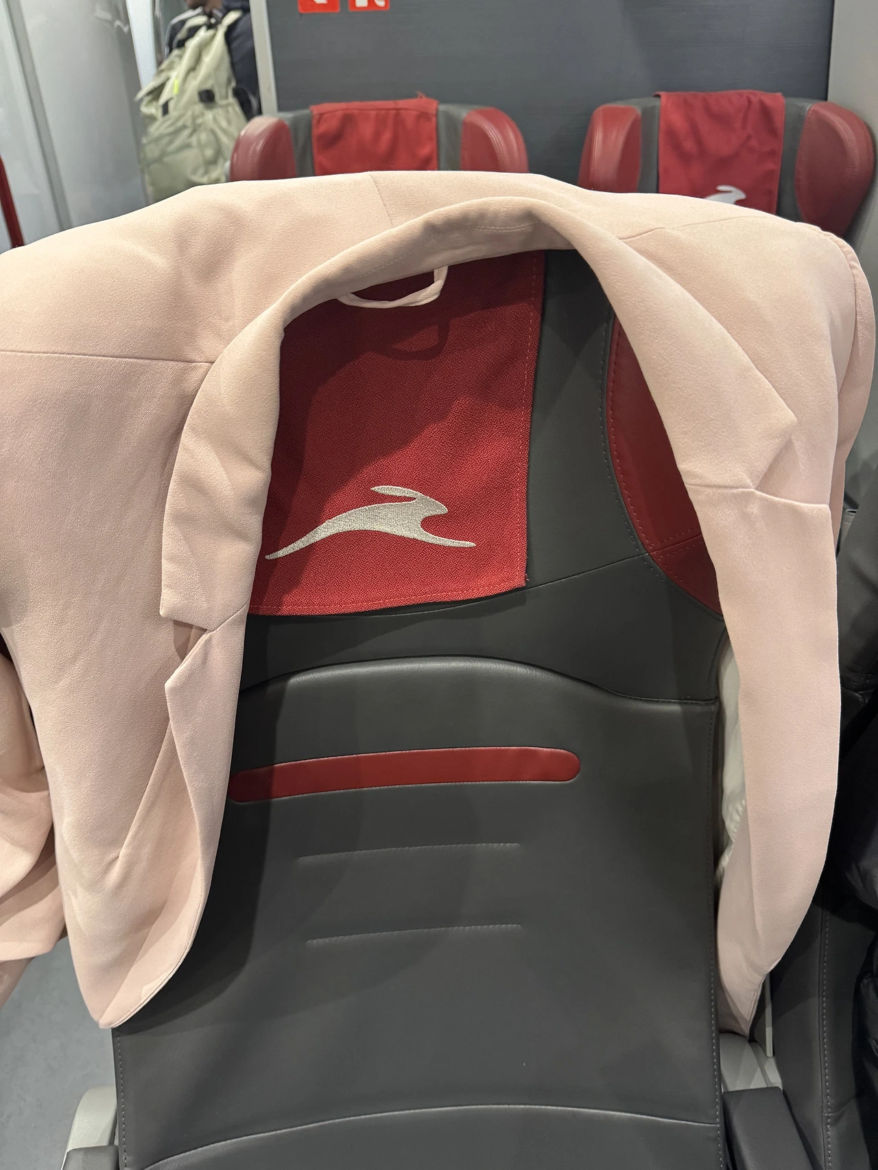 내가 앉아야할 자리를 찾고 보니 뒷좌석의 사람이 옷을 이렇게 걸어 놓으셨다. 이런 황당한 경우는 또 처음이라 뒷좌석을 쳐다 보았지만 마침 옷을 걸어둔 장본인은 자리를 비운 상태였다. 그 옆에 앉아계신 분께 일행인지 물어보았지만 불행히도 그는 영어를 하지 못했다. 아쉬운대로 통로 건너 옆에 앉아있는 젊은 커플과 대화한다.