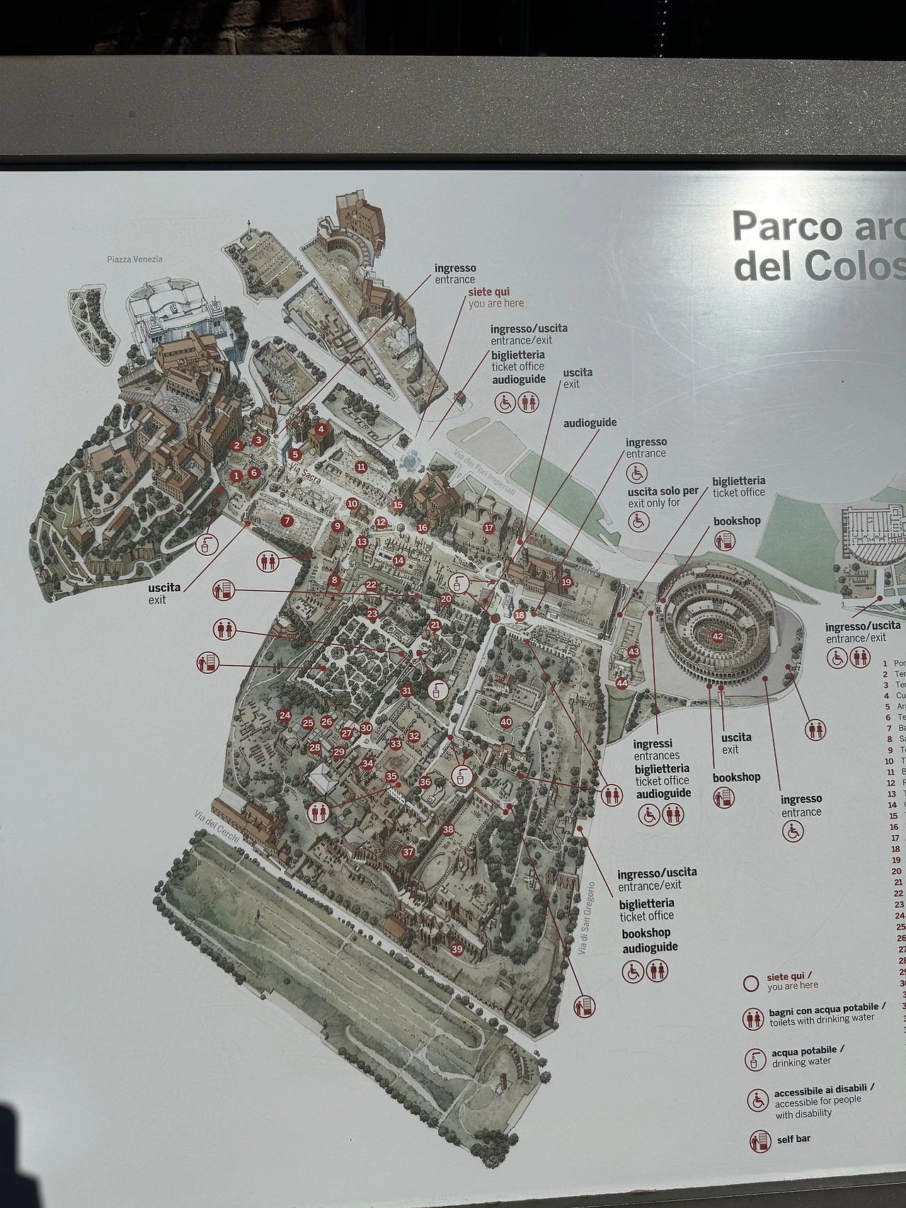 계단 밑으로 포로 로마노가 보인다. 이 계단을 옆으로 두고 내려가면 입구가 있었는데 무료입장이어도 표가 필요하기 때문에 들어갈 수 없었다. 매표소 위치가 어디냐고 물으니까 앞에 붙어있는 QR 코드를 가리킨다. 매표소 위치 링크로 연결되는 코드였는데 정말 하나도 도움이 되지 않았다. 콜로세움 쪽에 매표소가 있겠지 싶어 기껏 찾은 입구를 뒤로 하고 콜로세움 쪽으로 걸어갔다. 다행히 매표소의 줄은 그다지 길지 않아 금방 표를 구매할 수 있었다.