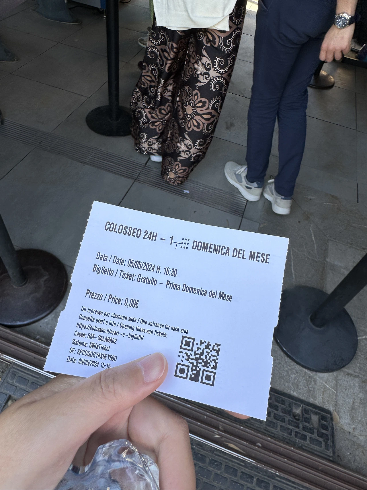 처음 입장을 한 뒤로 24시간만 유효한 입장권. 2024년 기준 입장권 가격이 18유로니 그만한 돈을 아낀 셈이다. 포로 로마노의 입구로 들어간 시간이 오후 3:20분. 줄이 긴 콜로세움과는 달리 입구도 여러 개고 줄도 별로 없다. 무엇보다 넓어서 사람들이 분산되기 때문에 콜로세움 안처럼 북적거리지는 않는다.