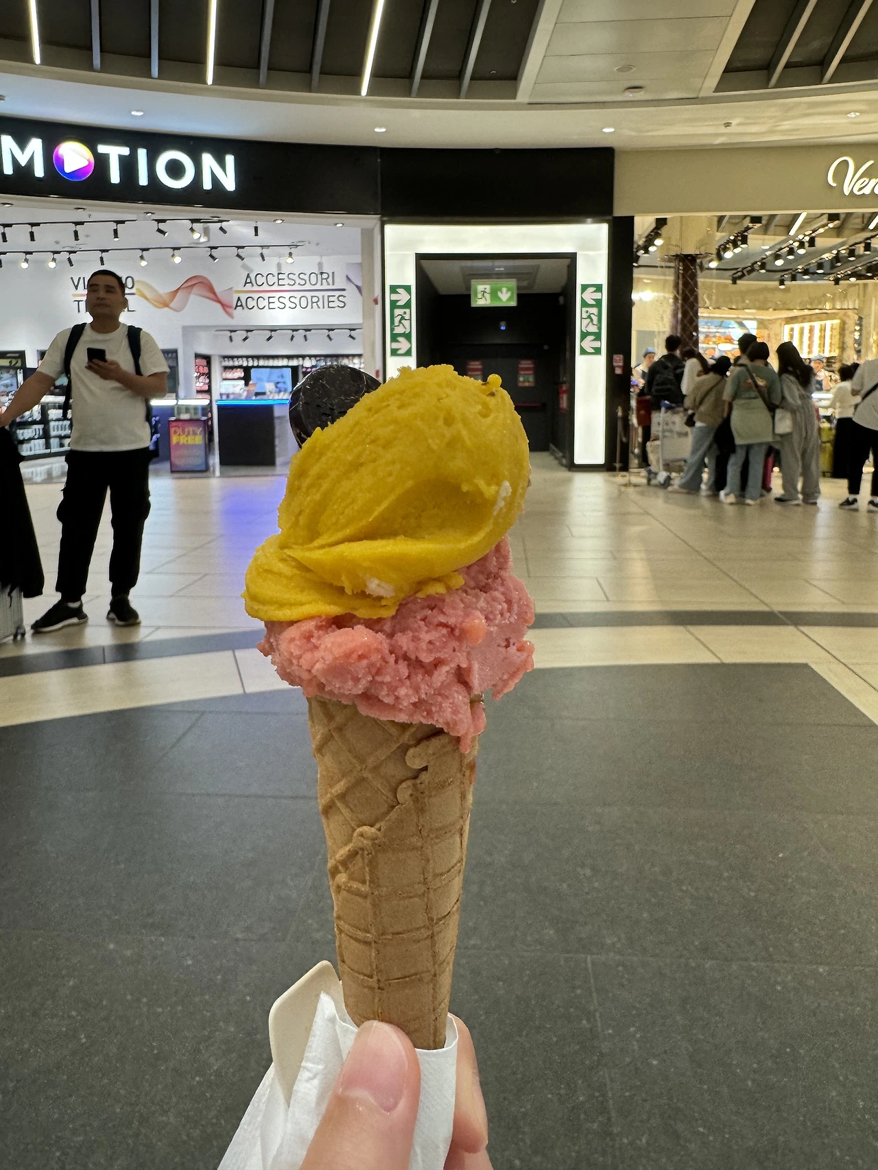 마지막으로 면세점에서 소소하게 쇼핑을 하고, 벵끼 Venchi에서 초콜릿 한 박스와 젤라또를 샀다. 라 로마나 젤라떼리아에서 사 먹은 무맛의 젤라또를 이탈리아 여행의 오점으로 남기기 싫었다. 그러니 이것이 내가 로마에서 사 먹는 마지막 젤라또다. 망고와 딸기, 둘 다 내가 좋아하는 맛들이다. 면세점에서 쇼핑을 하다 보니 시간 가는 줄 몰랐다. 탑승하고 보니 나는 usb 포트가 있는 비행기라 A씨에게 사진을 찍어 보냈다. 참고로 A씨도 그 전날 자신이 탄 비행기의 사진을 찍어 보내주었는데, 그가 탄 비행기는 또다시 한번 usb 포트가 없고 스크린이 코딱지만 한 기종이었다.