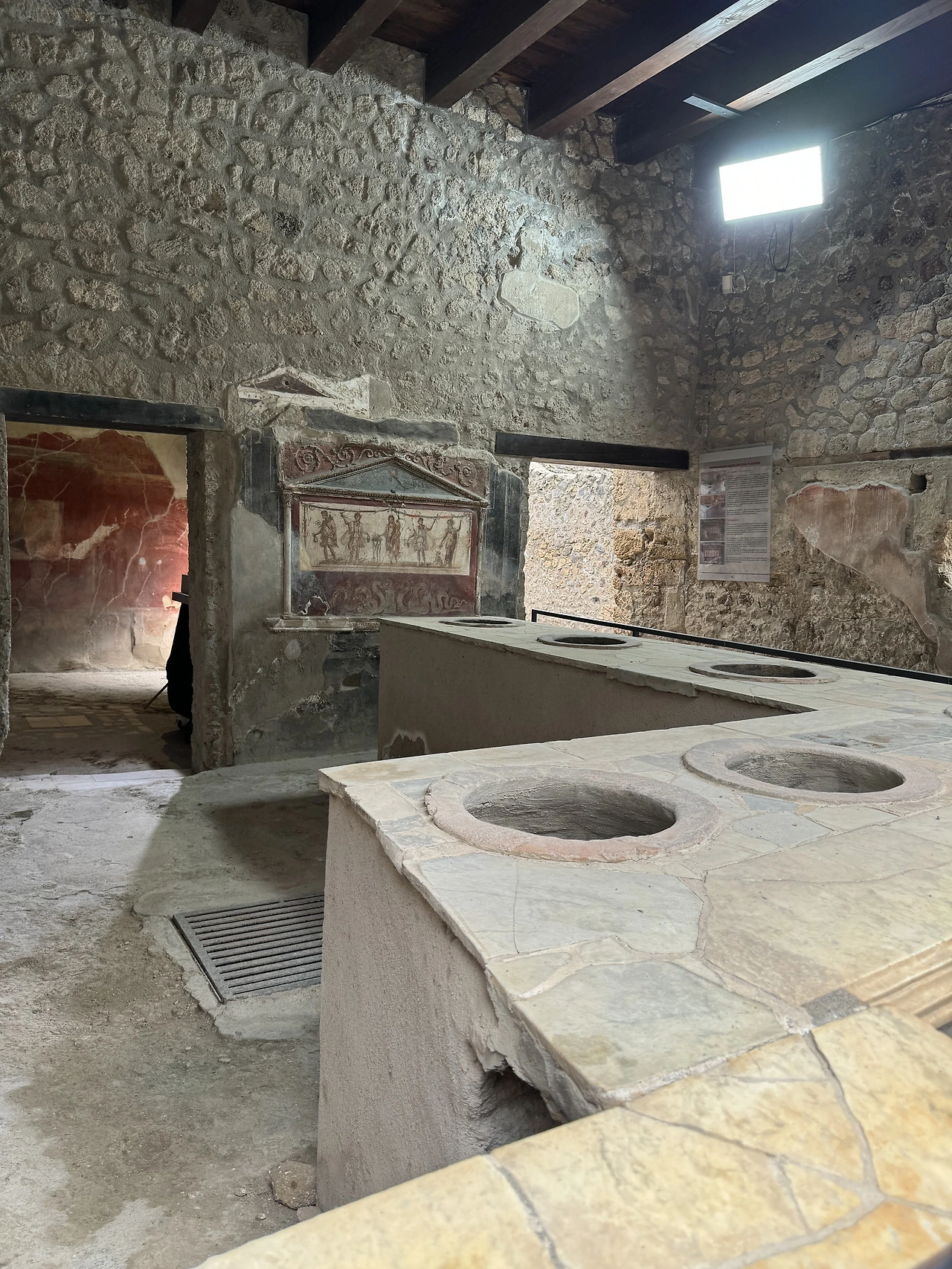 식당이 이렇게나 잘 보존되어 있다니. 희미한 기억을 더듬어 보자면 이곳이 발견되었던 당시에 동전을 넣은 단지가 어딘가 구석에서 발견되었는데, 주인이 도망가면서 단지를 숨긴 것으로 보인다고 했다. 돈을 그렇게 열심히 숨겨놓고 결국 찾지도 못했으니 분해서 어쩌나. 사실 목숨만 건졌어도 다행이었을 테지.