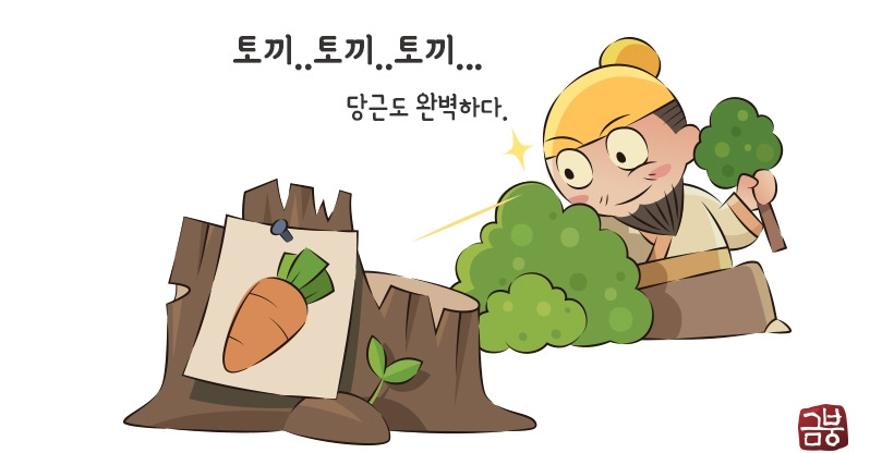 나무 그루터기(株)를 지키며(守) 토끼(兎)를 기다리다(待). 옛날 송나라에 한 농부가 있었습니다. 농부의 밭 가운데에는 오래된 그루터기가 있어 좀 불편했지만, 농부는 그런대로 열심히 밭을 갈아 생계를 꾸리고 있었습니다. 그러던 어느 날, 웬 토끼 한 마리가 밭으로 달려들더니 나무 그루터기에 부딪쳐 죽고 말습니다.