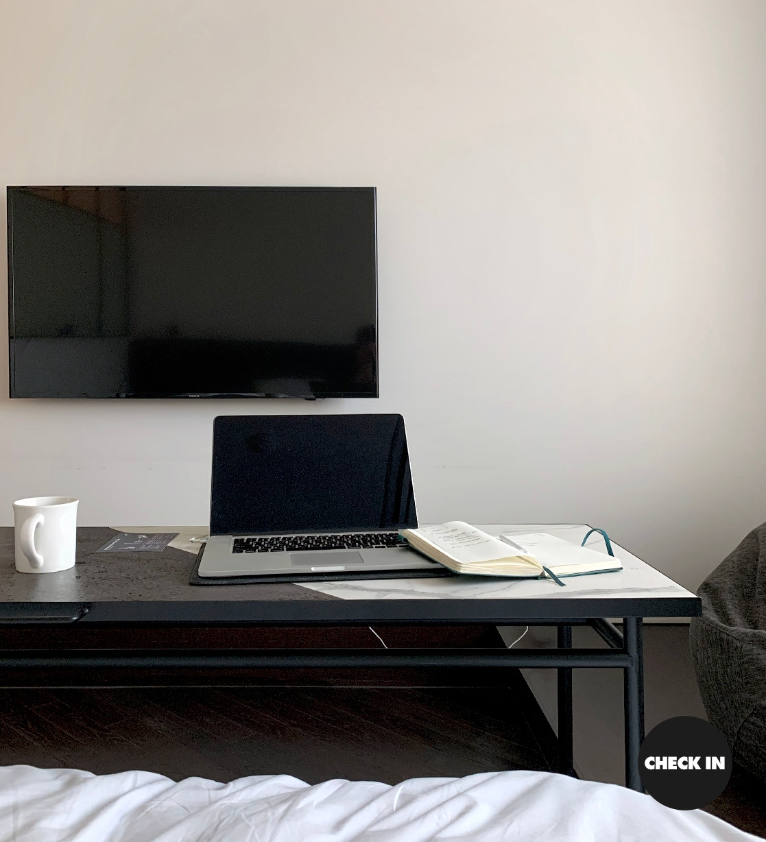 3년 된 맥북은 배터리가 내 통장 잔고처럼 쑥쑥 줄어들기 일쑤이다. 테이블을 침대 앞까지 끌어댕겼으니, 충전기를 꽂을 곳이 있을까.