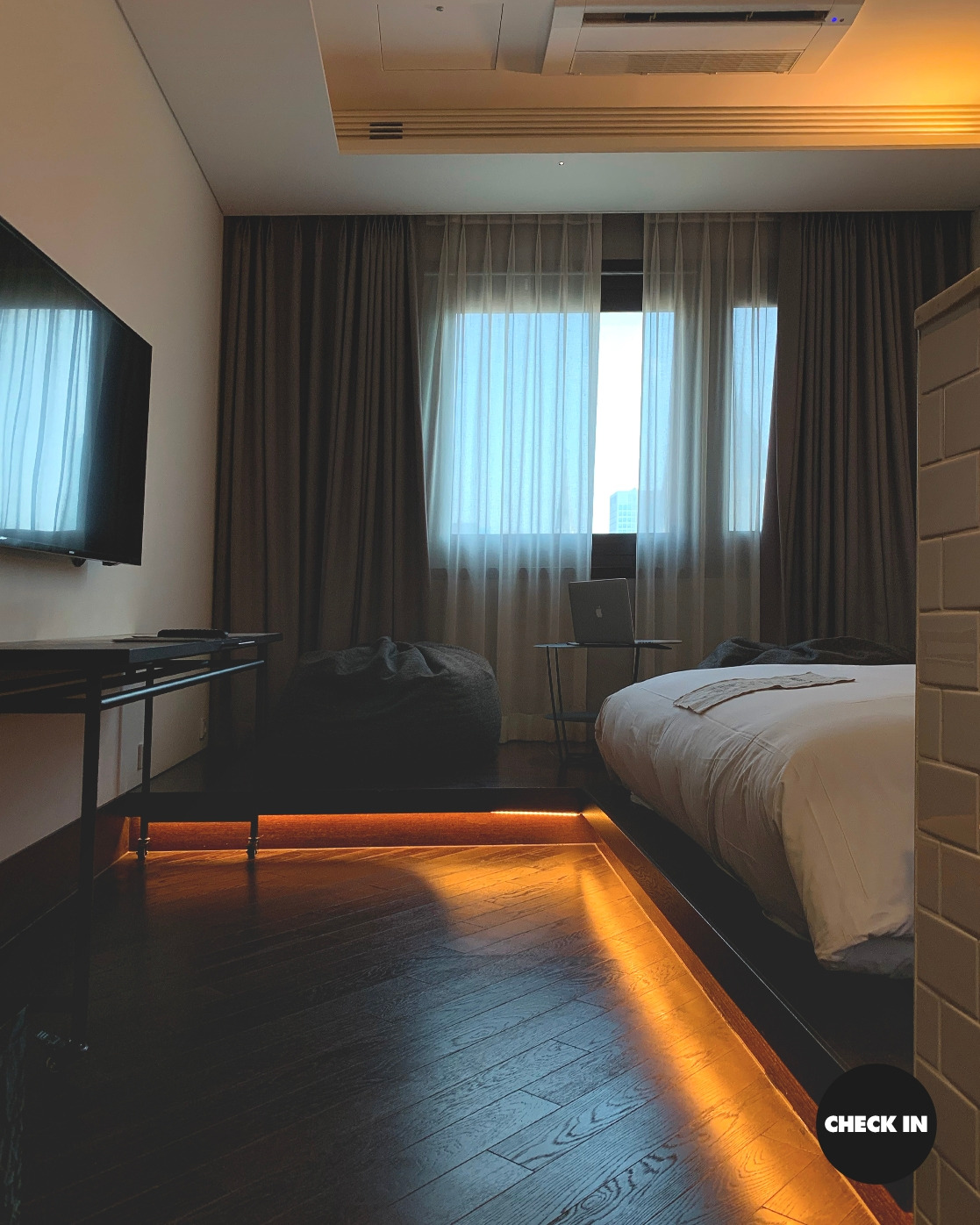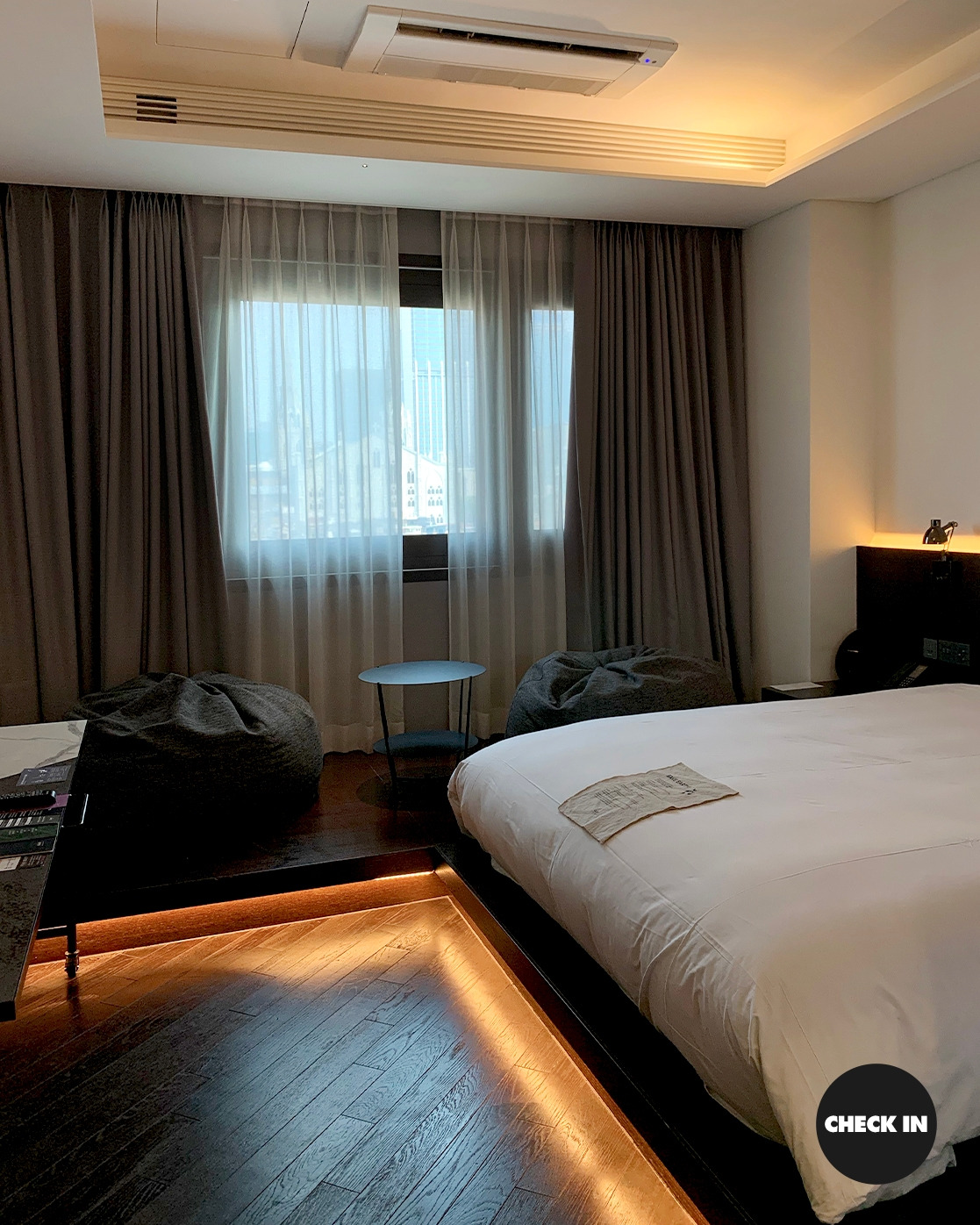 9층. 슈페리어 더블룸 도착. 객실 키를 꽂자 간접등이 은은하게 퍼진다.