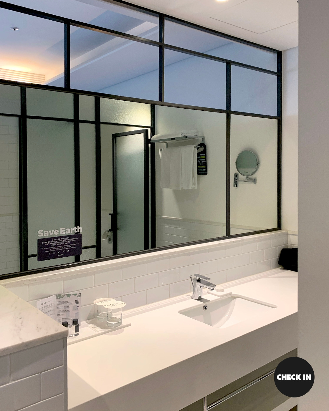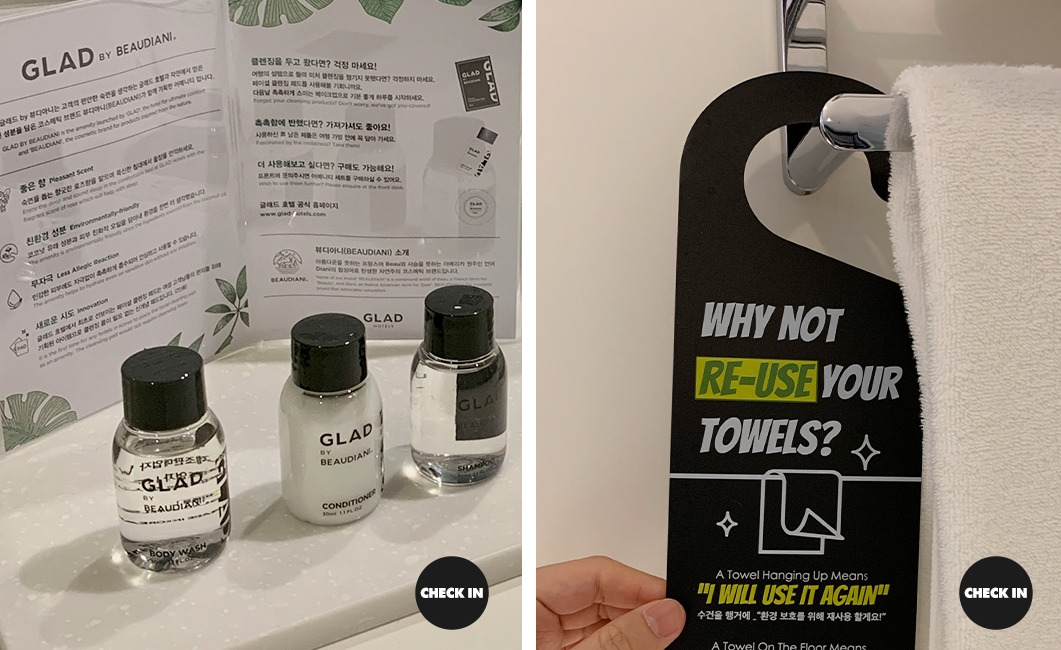 1회용 어메니티를 최소화하고 다 쓴 수건 및 사용한 침구류는 요청시 교체할 수 있으며, 수건의 경우 가급적이면 재사용을 권장하는 글래드라이브 강남.