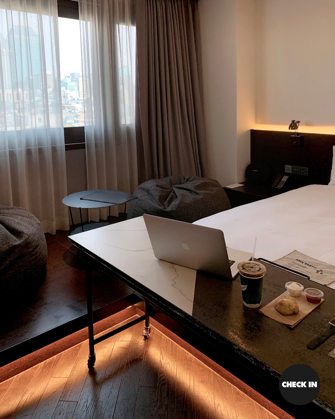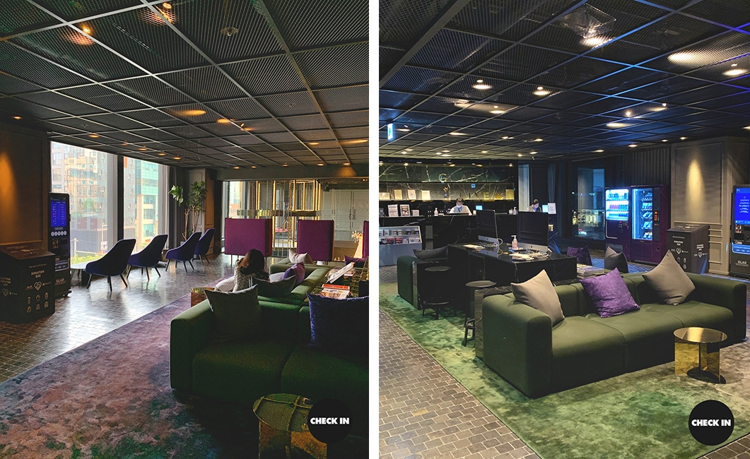 헙! 소리를 내며 입을 자동으로 틀어막게 되는 로비의 느낌은 아니다. 젊다. 그렇다고 너무 힙한 느낌은 아니다. 트렌디함 반 스푼, 힙함 반스푼 그리고 세련됨 한 스푼 넣었다. 딱 내 나이 또래 (20대후반-30대초)가 좋아할 만한 그런 감성이다. 이 로비는 그저 고개를 끄덕이게 되며 '음 그래 이 정도면 충분하지' 라는 생각을 들게 만든다.