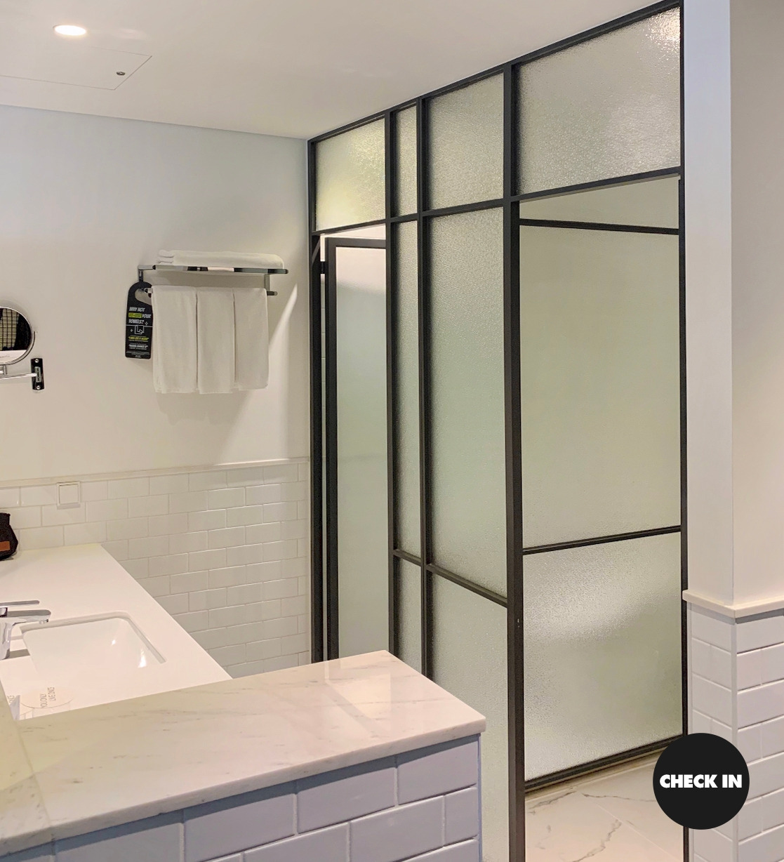 화장실 입구는 개방형으로 되어 있어 더 시원한 공간감을 자아낸다. 그리고 샤워부스와 화장실은 나뉘어져있다.