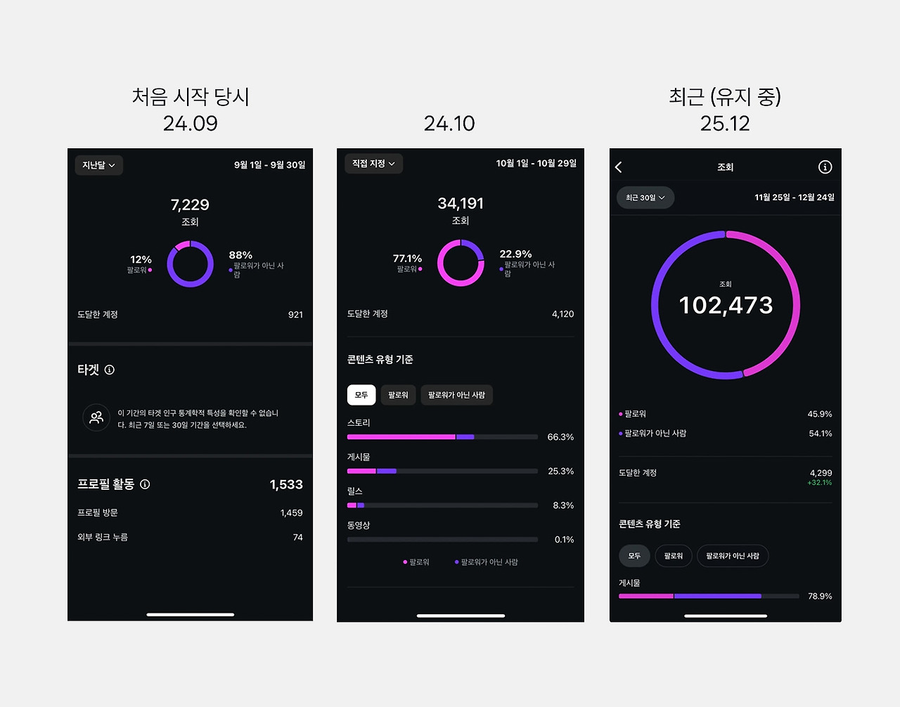 예산상 유료광고와 인플루언서 초청 그리고 팔로워 대상 이벤트를 할 수 없었습니다. 순전히 콘텐츠로만 밀고가야 했던 열악한 상황이었죠. 그렇게 4계절이 지난 지금.