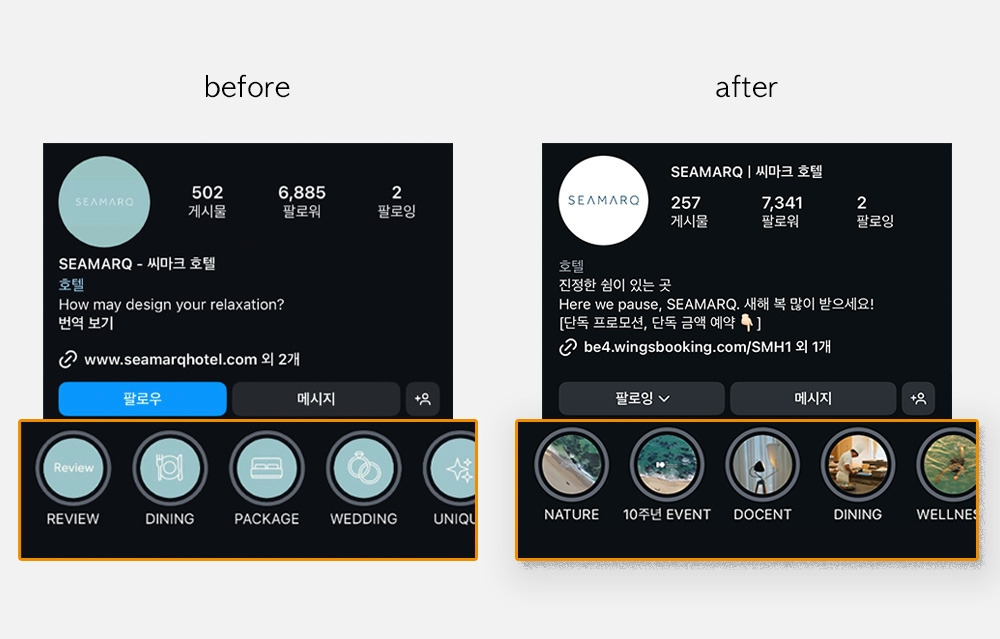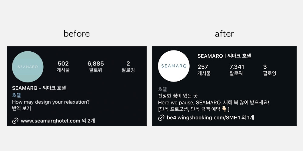 씨마크 호텔의 경우는 어떤 경험을 주고 싶은지와 프로필 링크 클릭을 이끌기 위한 문구를 넣었습니다. 문구는 시즌에 맞게 바뀌기도 해요. 새해에는 '새해 복 많이 받으세요' 정도로. 딱딱하게만 느껴지는 호텔이 저런 문구 하나로 부드러워질 수도 있으니.
