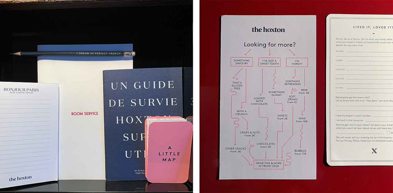 보통의 호텔은 객실내에 패션잡지 혹은 지역관광 소개 브로셔, 호텔을 소개하는 책자들이 비치되어 있기 마련이다. 혹스턴 호텔은 그런 것을 메인으로 두기 보단 철저하게 이 투숙객이 파리를 '제대로 느낄 수 있게' 세심한 부분까지 신경을 썼다는 것을 체감 할 수 있었다.