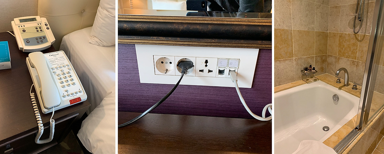 가령, 객실 전화기와 객실 전체를 조절하는 컨트롤러의 디자인을 보면 바로 00년대의 애니콜이 떠올라 추억을 회상 할 수 있습니다. 그리고 USB 꽂는 것 대신 220V 콘센트만 있습니다. 그리고 욕실의 전체적인 느낌 또한
