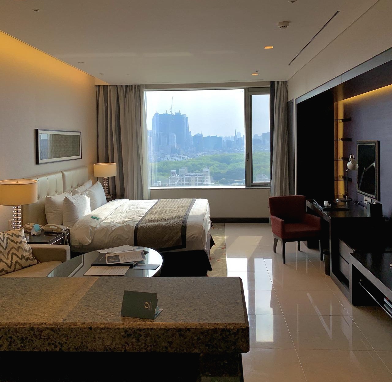 이렇게 객실 크기처럼 커다란 창문을 통해 삼성역 일대를 조망할 수 있으며 해가 지는 아름다운 모습을 만끽 할 수 있습니다. 날씨가 맑은 날에 투숙을 했던 터라, 해가 질때 나오는 은은한 햇빛과 핑크빛과 보라빛이 합쳐져 서서히 어두워지는 일몰의 모습을 볼 수 있었습니다.