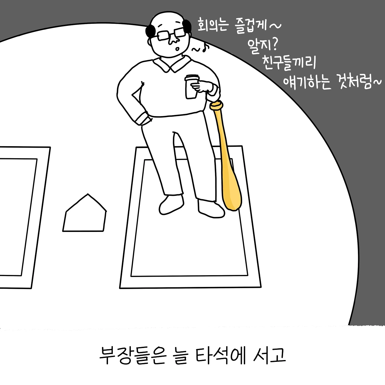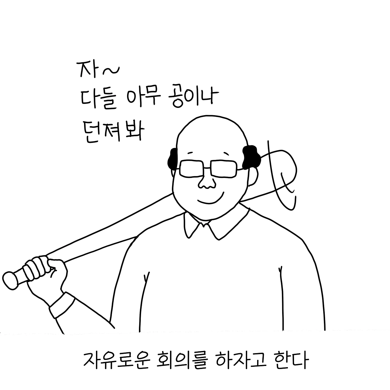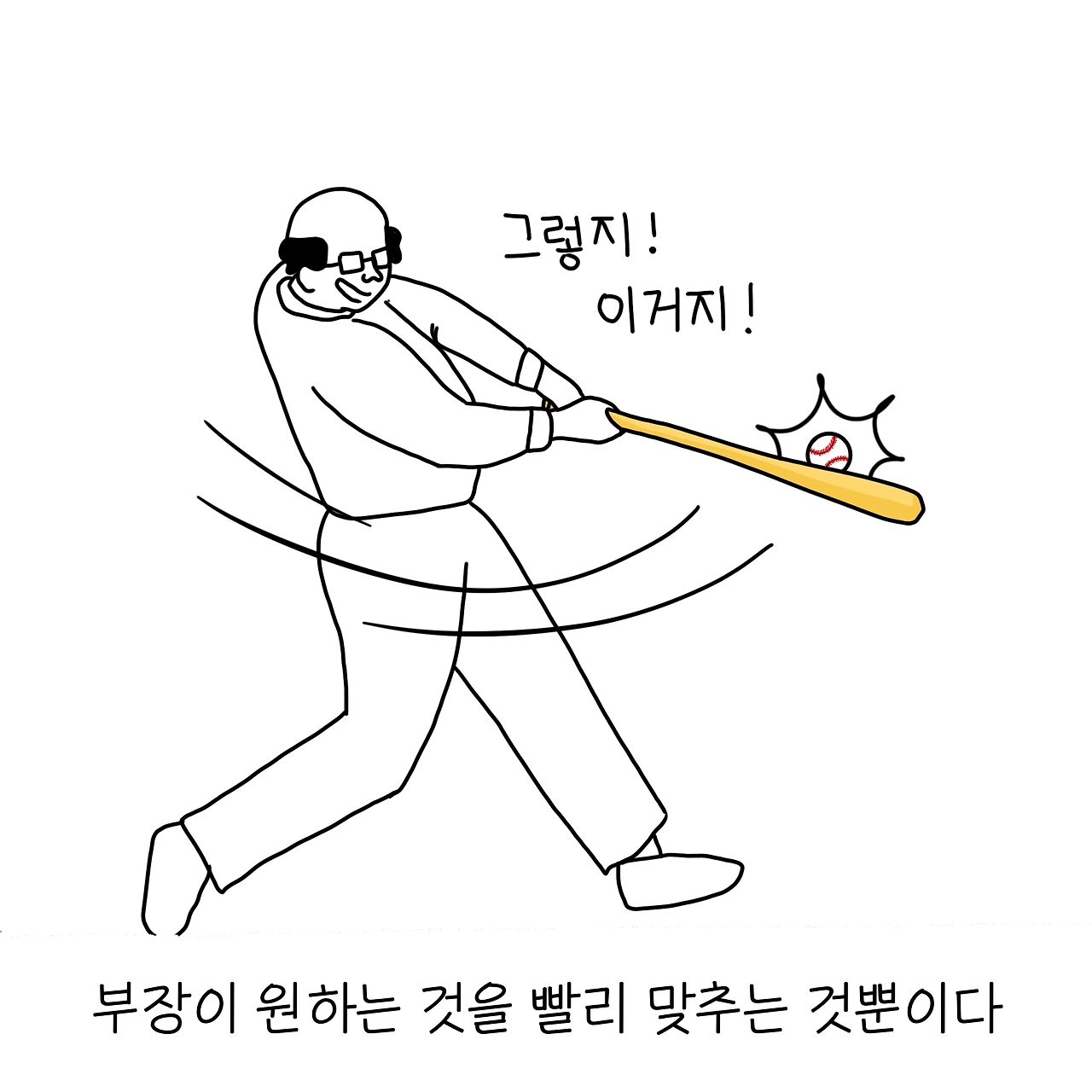 회사일은 회의의 연속이다 부장들은 늘 타석에 서고자유로운 회의를 하자고 한다하지만열심히 아이디어를 던져봤자별 소용은 없다답은 이미 정해져 있기 때문이다이 지루한 도돌이표를 끝낼 수 있는 방법은부장이 원하는 것을 빨리 맞추는 것뿐이다독재자는 민주주의의 탈을 쓰고 다닌다