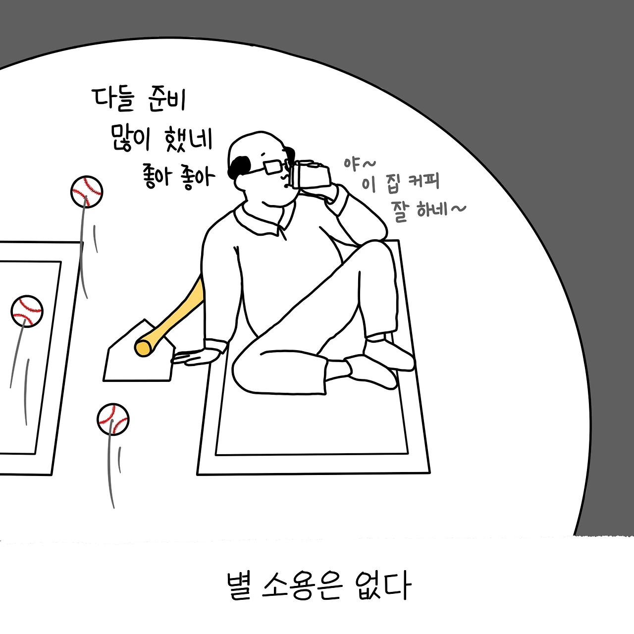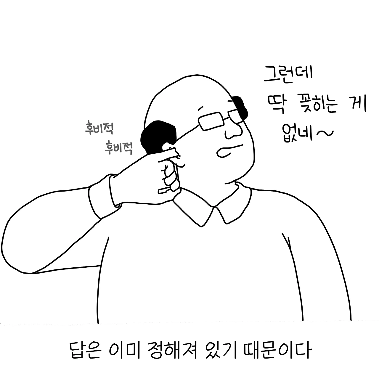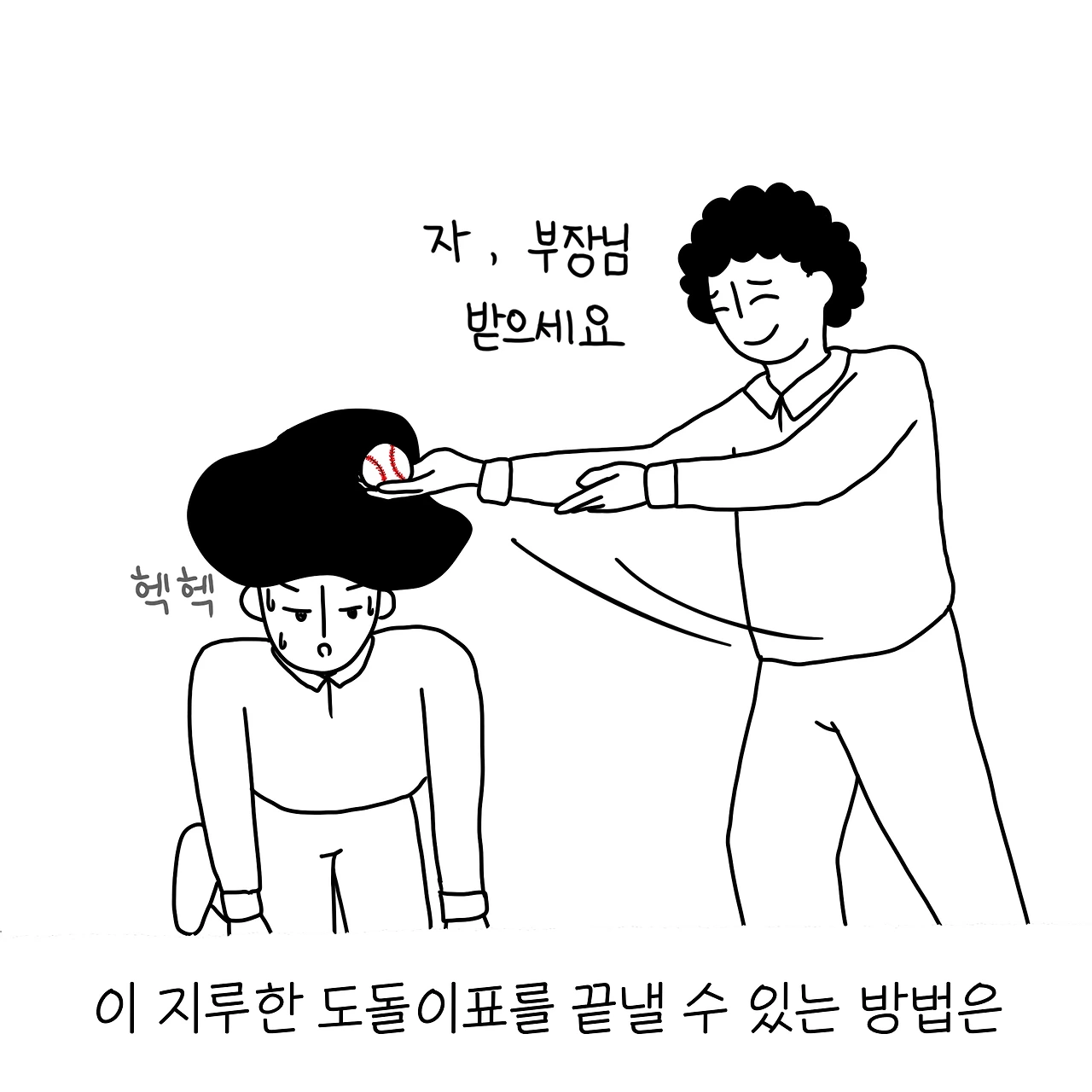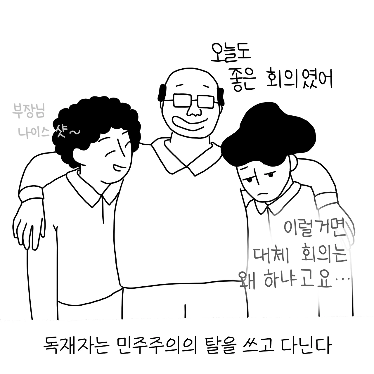 회사일은 회의의 연속이다 부장들은 늘 타석에 서고자유로운 회의를 하자고 한다하지만열심히 아이디어를 던져봤자별 소용은 없다답은 이미 정해져 있기 때문이다이 지루한 도돌이표를 끝낼 수 있는 방법은부장이 원하는 것을 빨리 맞추는 것뿐이다독재자는 민주주의의 탈을 쓰고 다닌다