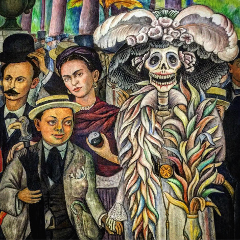 여기서 가장 주목할 만한 부분은 바로 죽은 자에 대한 이미지다. <코코>는 죽은 자들을 생전의 모습과 유사한 영혼의 형태나 귀신의 형태 등 다소 추상화된 개념으로 이미지화하지 않고 해골의 형태로 묘사하는데, 이것은 사실 멕시코의 사후 세계관과 관련된 문화를 그대로 반영한 것이다. 실제 디에고의 대표작, 그것도 작품의 가장 중심부에서도 그 상징을 볼 수 있다.