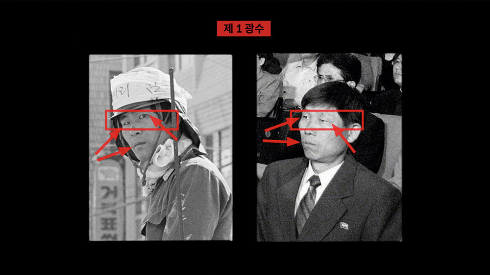 지만원 씨는 1980년 당시 촬영된 광주 시민군들의 얼굴을 분석했다. 그리고는 온라인과 각종 언론에 등장하는 북한 주요 인사들의 얼굴과 이들의 얼굴을 겹쳐보기 시작했다. 그 결과 지만원 씨는 시민군들이 대부분 북한 사람이라는 결론을 내렸다. 눈매나 얼굴의 비율 등이 일치하기 때문에 동일인물로 봐야 한다는 것이다. 그는 시민군의 얼굴 위로 붉은 화살표를 긋고, 머리 위로는 붉은 점을 찍어대기 시작했다. 진실을 가리기 위한 일종의 표식이자 낙인이었다. 그리고 이들을 지칭하기 위해 '광수'라는 이름을 지어냈다.