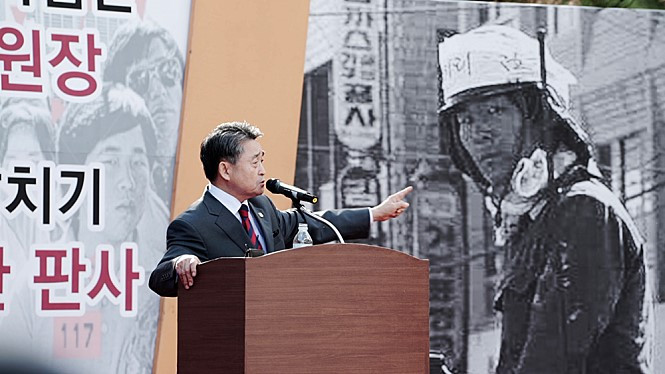 다부진 한 남성이 카메라 렌즈를 응시하고 있다. 날카로운 눈매에는 강렬한 의지가 느껴지지만 굳게 다문 입매에는 긴장과 두려움도 공존한다. 그의 앞으로는 길게 뻗은 두꺼운 총열이 단호하고, 그 위로는 금방이라도 쏟아져 나갈 것 같은 두터운 총알들이 늘어져 있다. 사진 속 주인공은 당시 시민군의 '페퍼포그 차량' 위에 자리하고 있지만, 그곳은 5.18 민주화 운동의 한 페이지이기도 했다. 영화 <김 군>은 바로 이 사진 한 장에서 시작됐다.