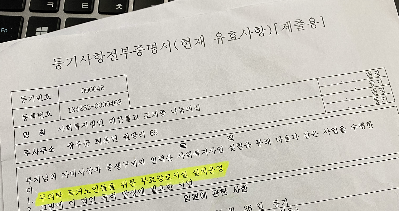 일단 나눔의 집의 등기를 한번 확인해보기로 했다. 등기를 떼보면 해당 시설의 사업 목적을 알 수 있기 때문이다. 우선 등기에는 조계종의 법인답게 '부처님의 자비사상과 중생구제의 원덕'이라는 표현이 들어있었다. 그런데 사업 목적 항목에는 아주 간단하게 두 줄만 적혀있었다.