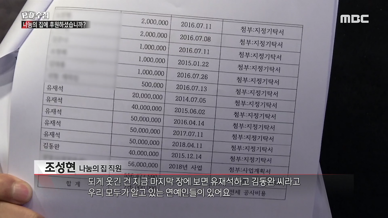 이 수상한 서류에는 생활관 증축 공사에 기꺼이 동의해줬다는 많은 후원자들의 이름과 수억 단위의 후원금이 기록되어 있었다. 그런데 그중 눈에 띄는 이름이 하나 있었다. 바로 유재석이었다. 서류에 따르면 유재석씨가 무려 2억 1천만 원의 후원금을 이 생활관 증축 공사에 사용하도록 협조해줬다고 되어있었다. 정말 그랬을까? 위안부 피해 할머니들도 아니고 다른 일반 할머니들을 모시기 위한 증축 공사에? 유재석씨가?