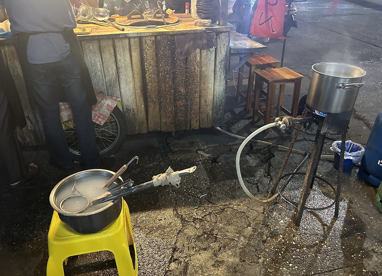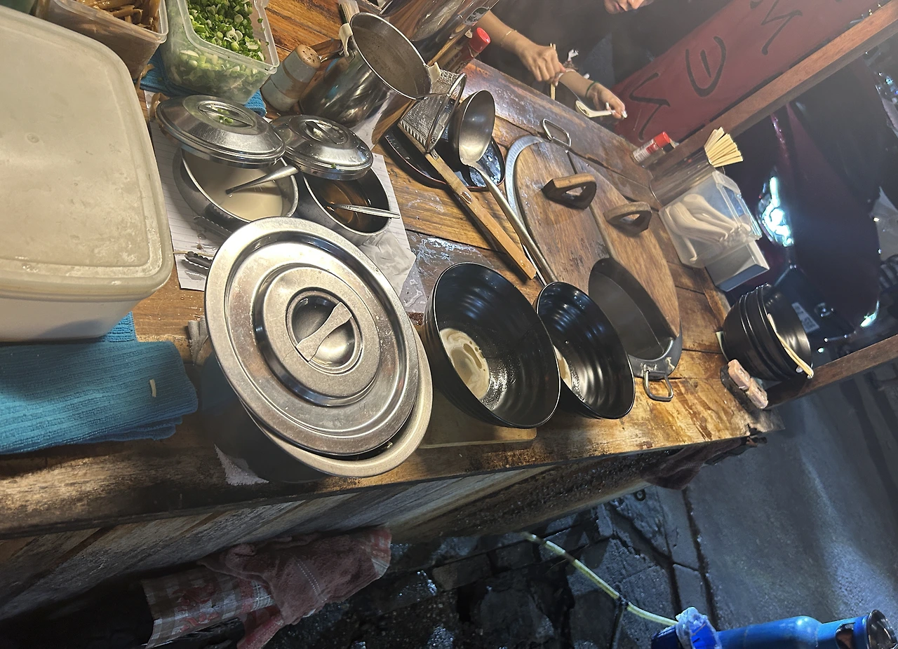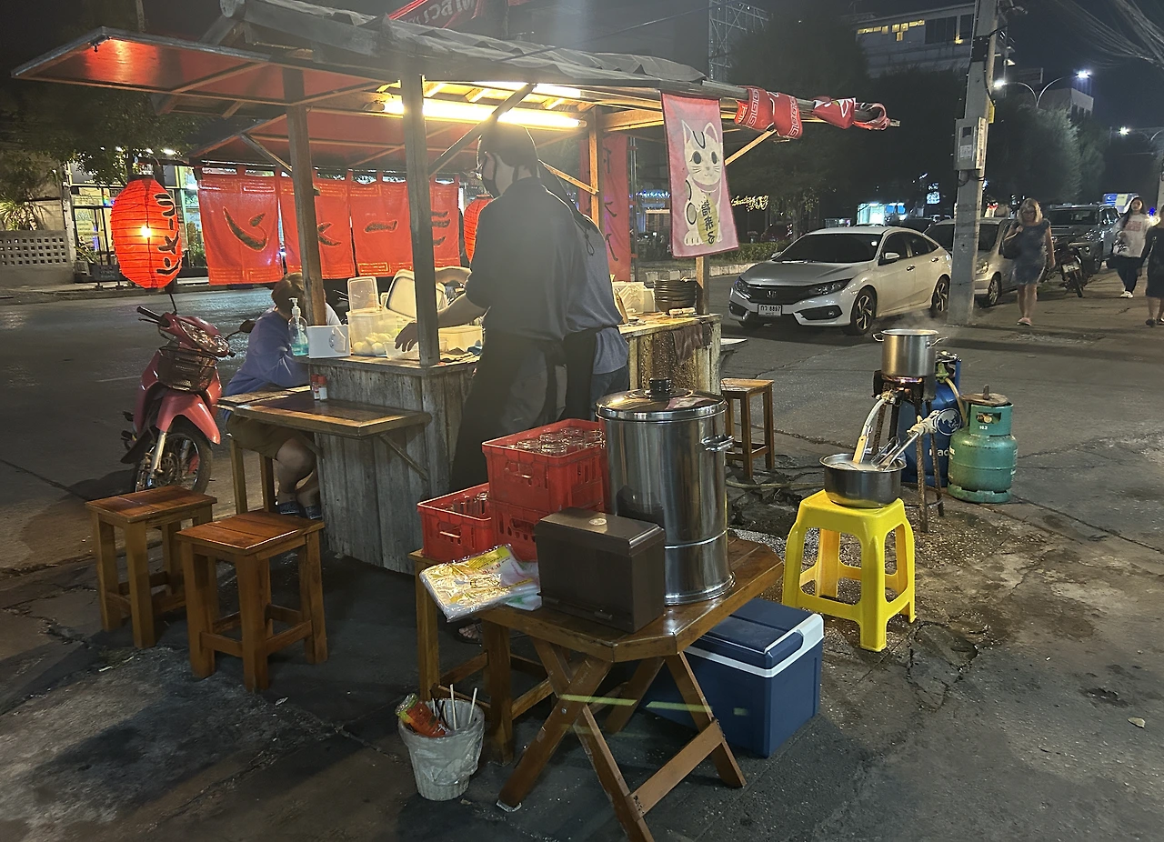 길거리에 포장마차 같은 작은 간이 가게에는 6-7명의 손님이 앉을 수 있는 규모이고, 길거리에 펼쳐진 식탁은 2 테이블 정도 ㅋ