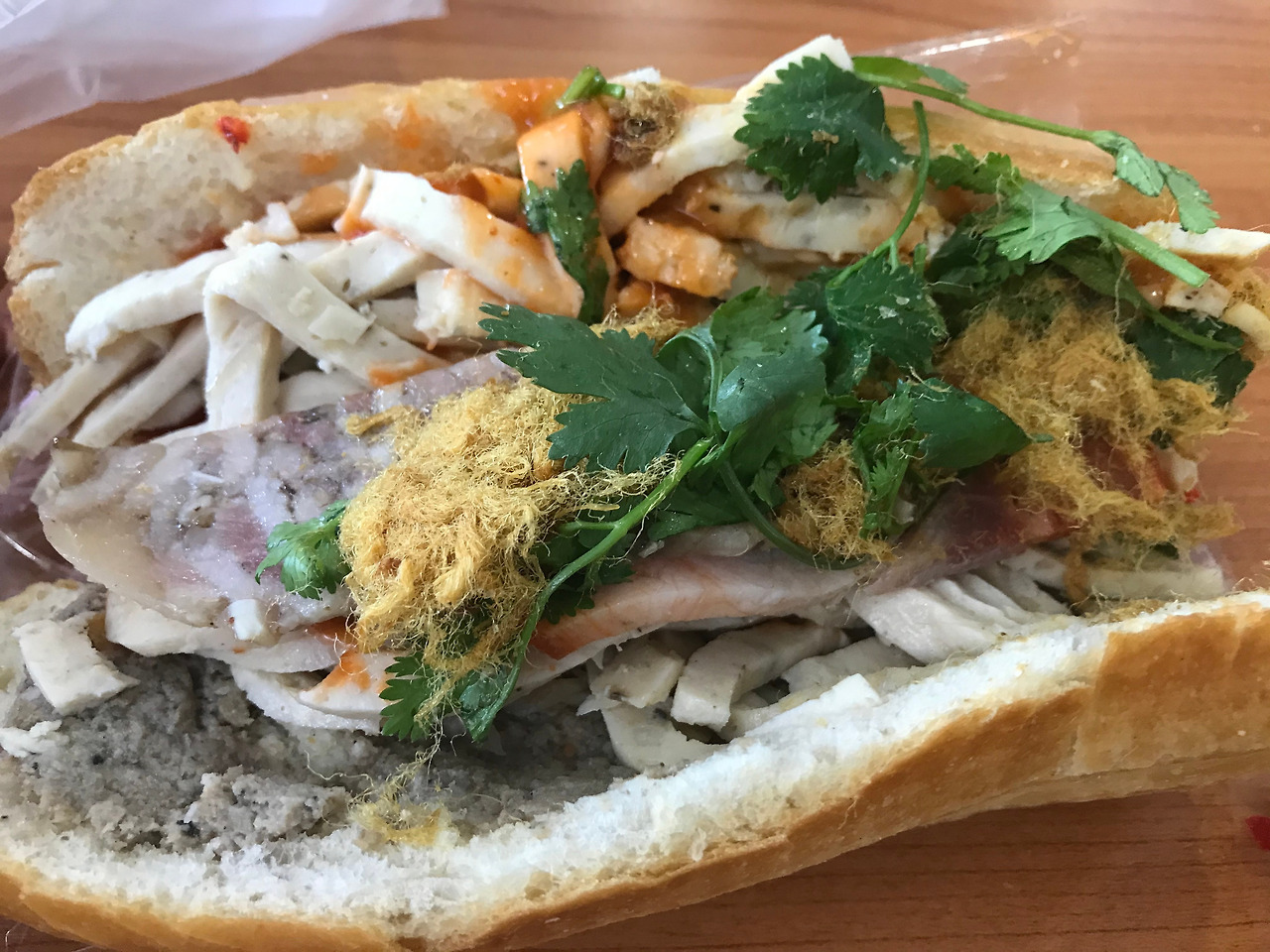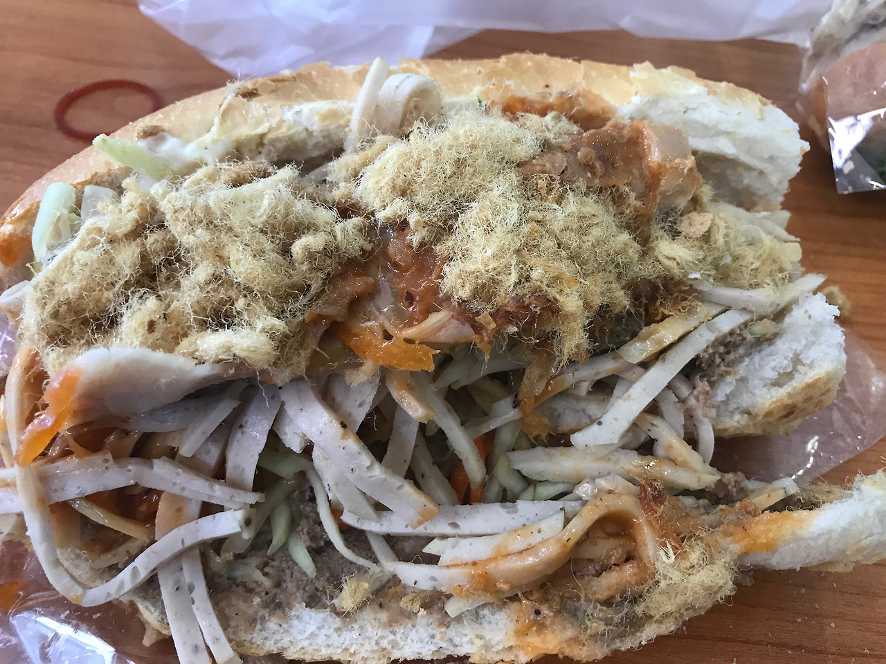 그 속재료를 설명하자면, 편육, 돼지고기, 빵 옆에 기본적으로 바르는 소스, 야채와 또 다른 매콤한 소스, 그리고 돼지고기를 말린 실타래 '무포이'까지.