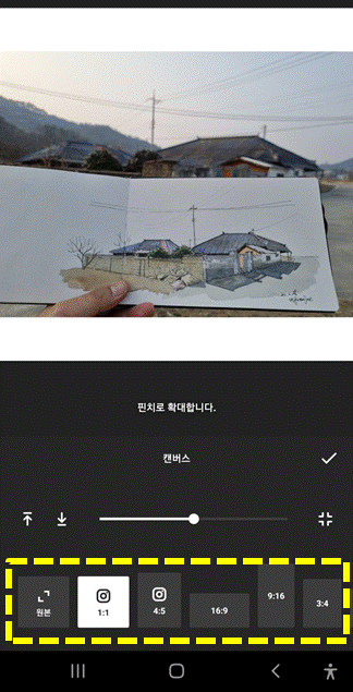 이렇게 하면 원하는 비율로 지정한 후 그림이 잘리지 않게끔 수정하여 인스타그램에 업로드 할 수 있습니다.