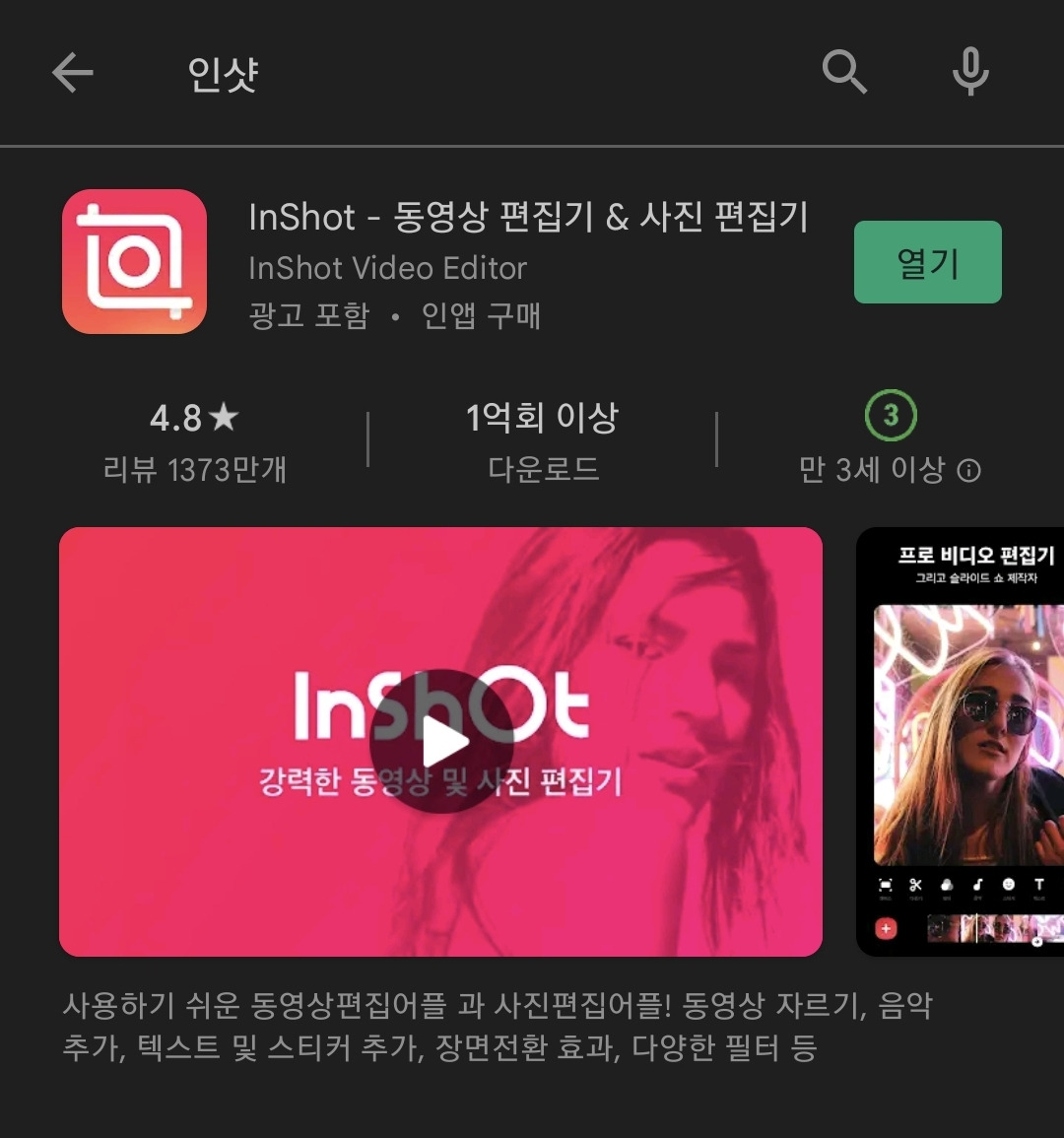 ‘inshot’, 또는 ‘인샷’으로 검색하면 쉽게 찾으실 수 있습니다. 이 어플도 제가 사용하고 있는 어플이라는 이유로 지정한 것 뿐이니, 다른 어플과 비교하기는 어렵습니다. 단 이 어플도 스마트폰을 바꾼 후에도 그대로 오랫동안 사용하고 있습니다.