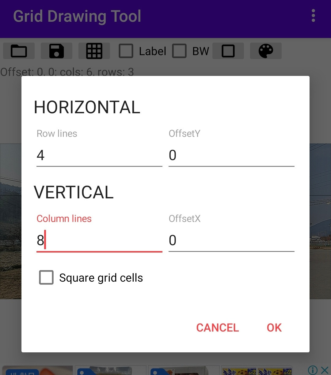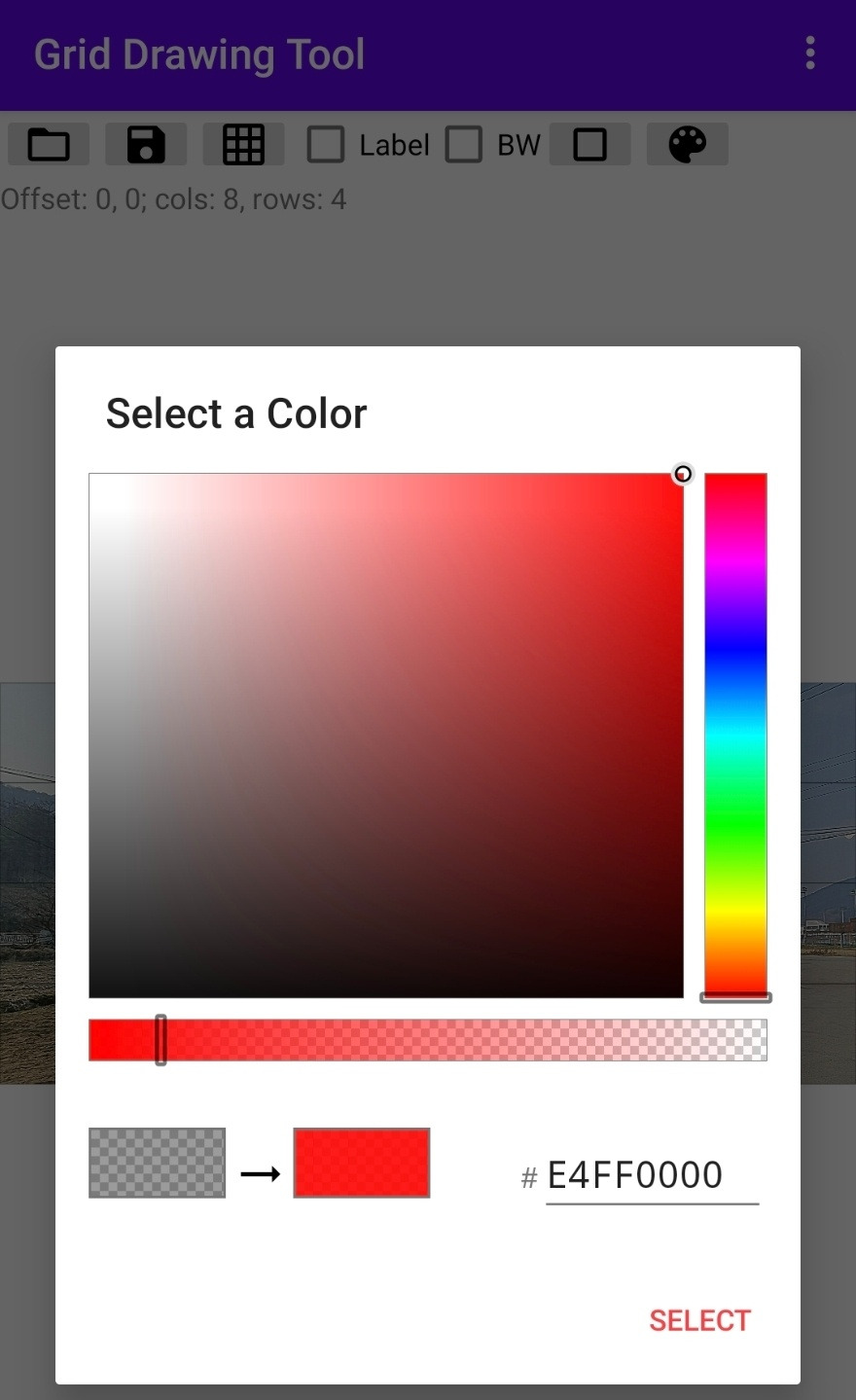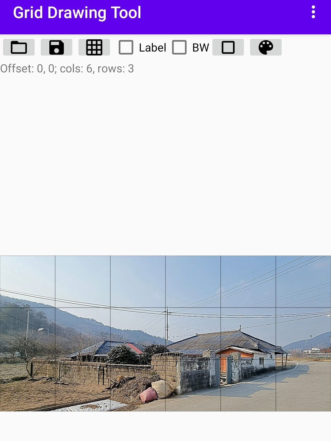 그 다음 ‘grid’ 어플을 실행히킨 후 격자를 넣습니다. 가로 그림일 때는 세로줄을 4개, 세로그림일 때는 가로줄을 4개로 기준으로 하고, 정사각형과 비슷한 사각형이 나오도록 가로줄이나 세로줄의 수를 정합니다. 대부분 4:6, 또는 6:4 등의 비율이 나오는데요. 위 사진은 스케치북(저널북, 아르쉬 중목 300g)에 길게 그리기 위해 16:9로 자른 후, 자른 이미지 비율과 비슷한 4X8의 격자를 만들었습니다. 사진을 불러온 후 가로 세로 줄의 개수를 지정한 후, 격자가 잘 보이도록 색깔과 진하기도 지정하였습니다.