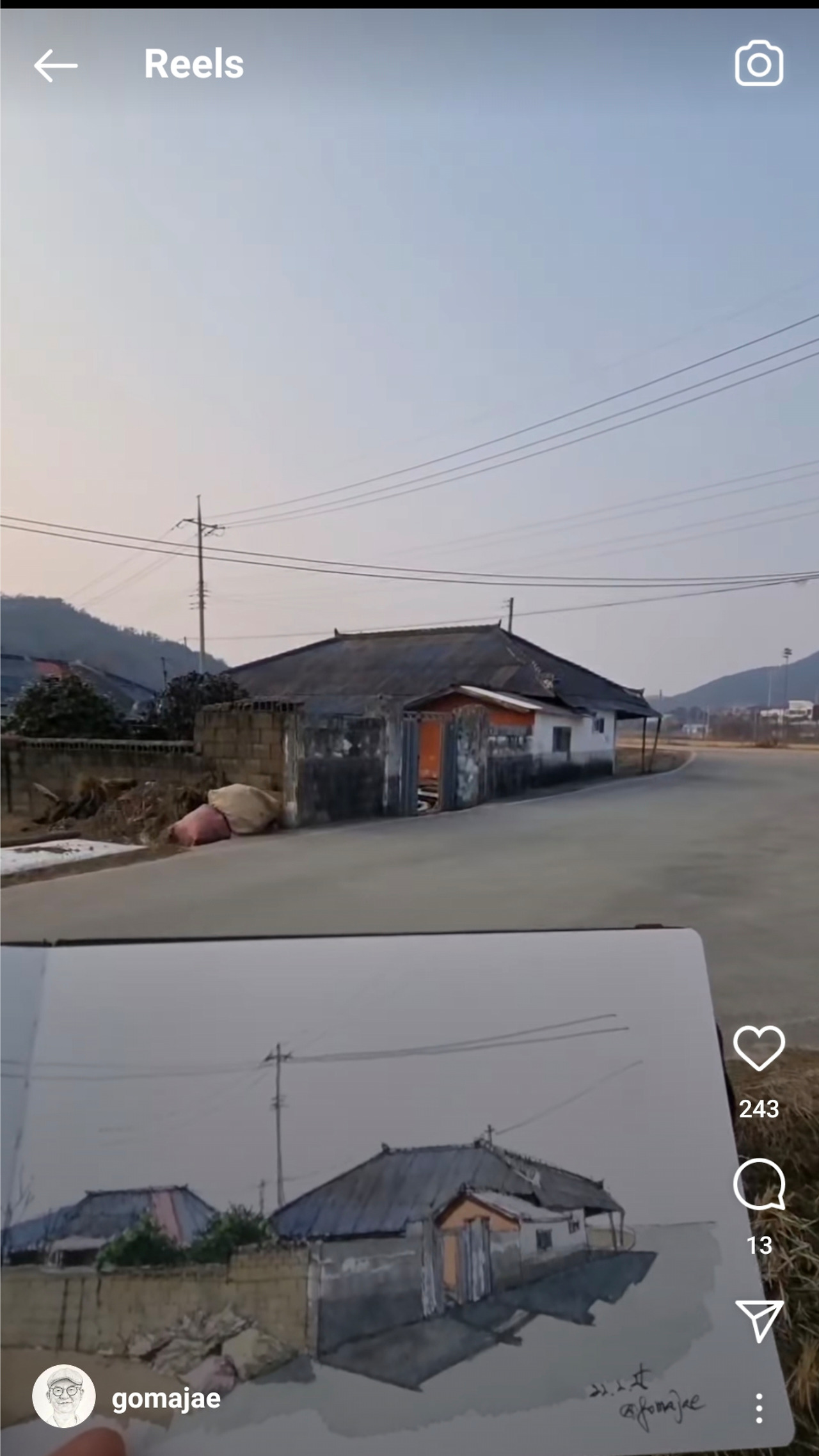 아래는 같은 사진을 인스타그램에 16:9 (세로) 비율로 업로드 한 동영상 릴스(Reels)와 1:1 비율로 업로드한 게시물입니다.