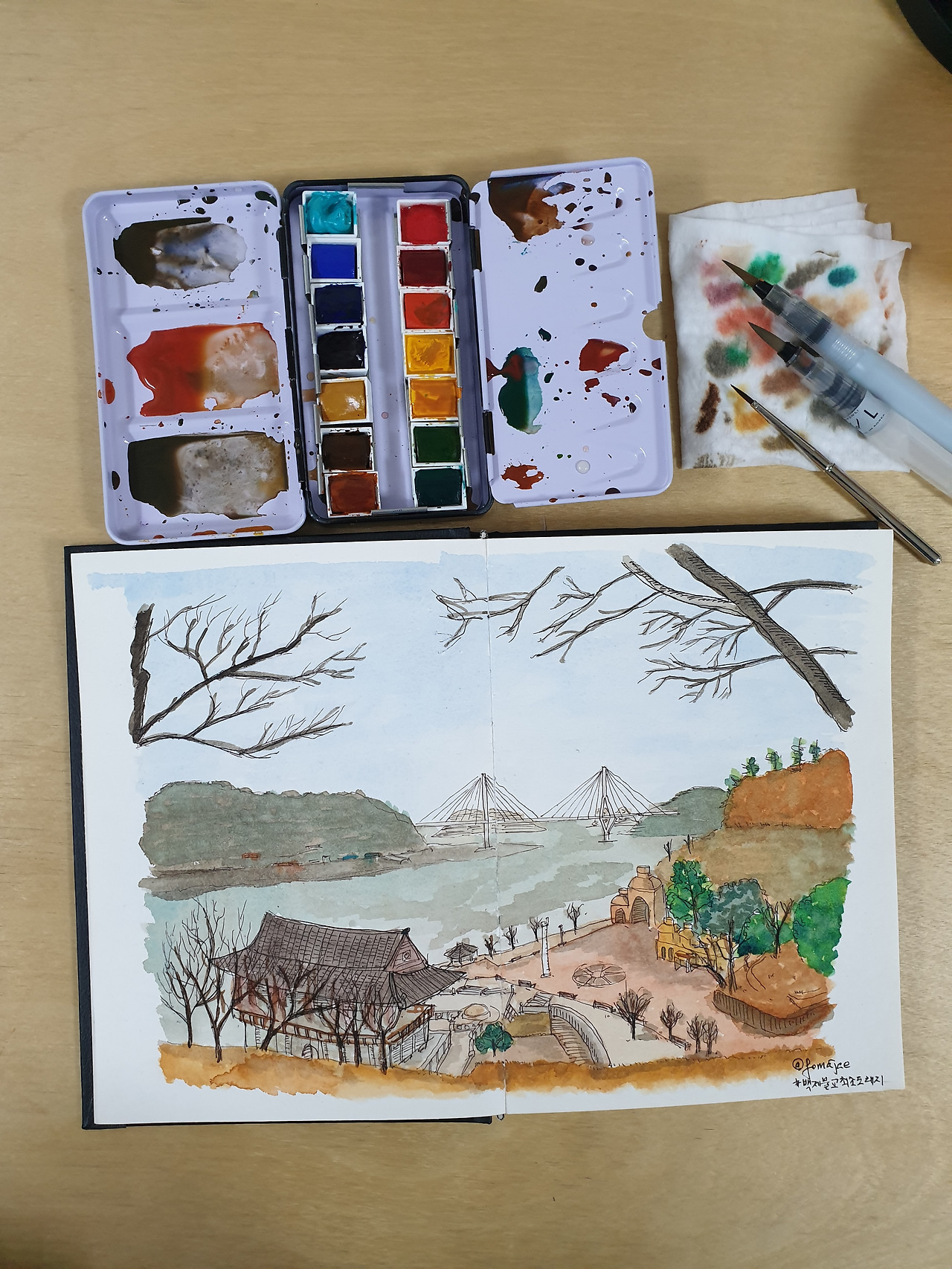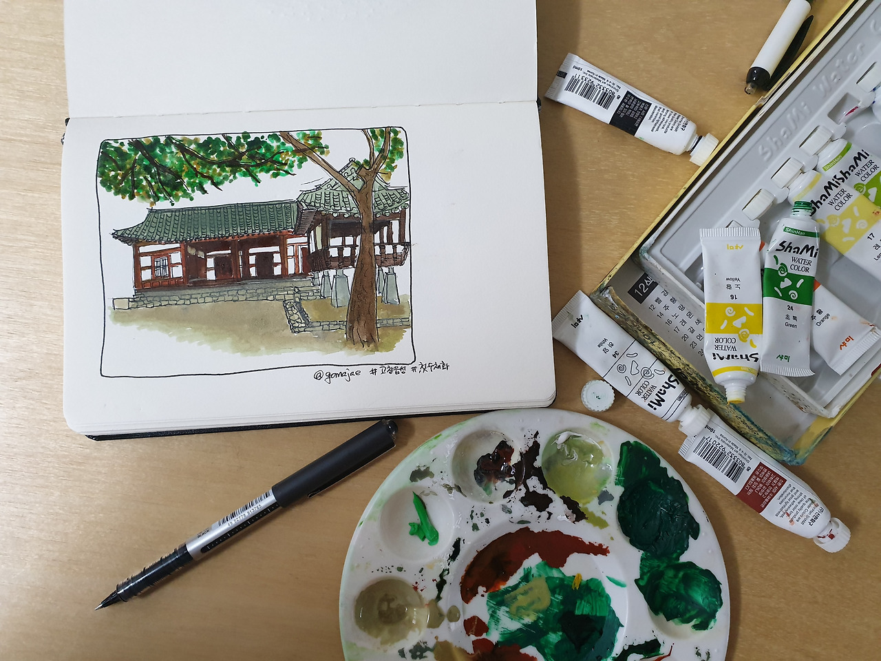 설명하고보니 첫 글에는 ‘종이와 펜만 있으면 된다고 하더니....’ 하며 배신감을 느끼실 분들도 계실겁니다. 그렇게 생각하지 마세요. 저도 제가 이럴까봐 수채화를 시작하는 것을 두려워했거든요. 그래서 취미그림을 시작하고 1년 가까이 펜드로잉 위주로 그림을 그렸습니다. 덕분에 스케치가 탄탄하다는 칭찬도 듣고 있습니다만... 없는 도구가 없다는 칭찬(?)을 더 많이 받습니다. 쿨럭.